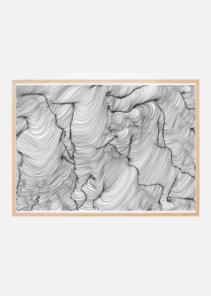 Abstraktní umělecký plakát v černém inkoustu se zvlněnými liniemi, které tvoří zajímavé tvary, vytvořený Belindou Hellberg, Hells Bells Sthlm. Motiv je obklopen trochu tenčím bílým paspartou, která efektivně zvýrazňuje jeho obsah. Jednoduchý a elegantní plakát, který se snadno kombinuje s dalšími oblíbenými na větší obrazové stěně.