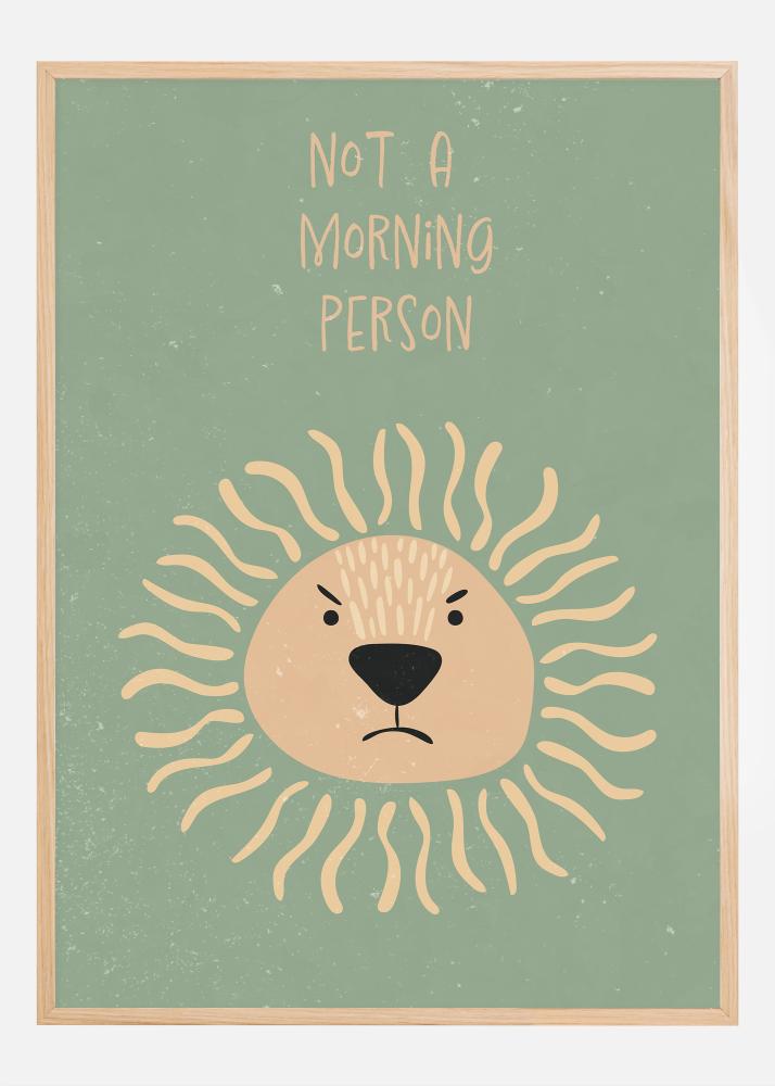 S hravým výrazem a okouzlujícím poselstvím je tento plakát zábavným dekoračním prvkem pro každého, kdo není úplně ranním člověkem. Ilustrace zobrazuje roztomilého lva s účesem připomínajícím sluneční paprsky, doprovázeného textem "NOT A MORNING PERSON" v uvolněném, ručně psaném stylu. Tlumený zelený odstín pozadí poskytuje uklidňující efekt, zatímco teplé žluté a béžové tóny lva vytvářejí měkký a příjemný pocit.