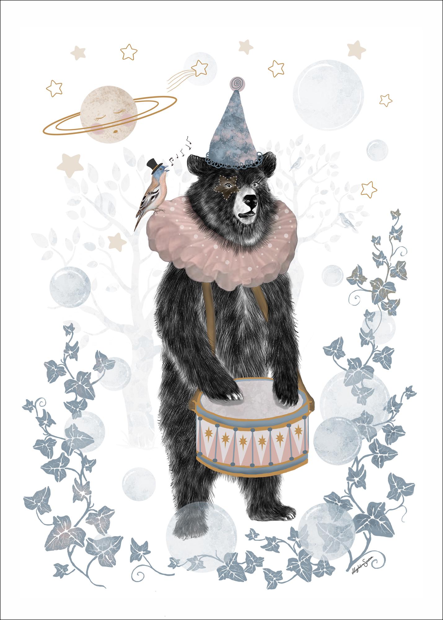 Vtipný obrázek hnědého medvěda, který hraje na buben. Plakát je pokryt šedými břečťanovými listy, světle hnědými hvězdami a má jemně hnědý obrázek Saturna, který se dívá dolů na medvěda. Bledě růžové barvy na bubnu a medvědově límci zvýrazňují krásu ptáčka, který sedí na medvědově rameni. Krásné pro dětský pokoj.