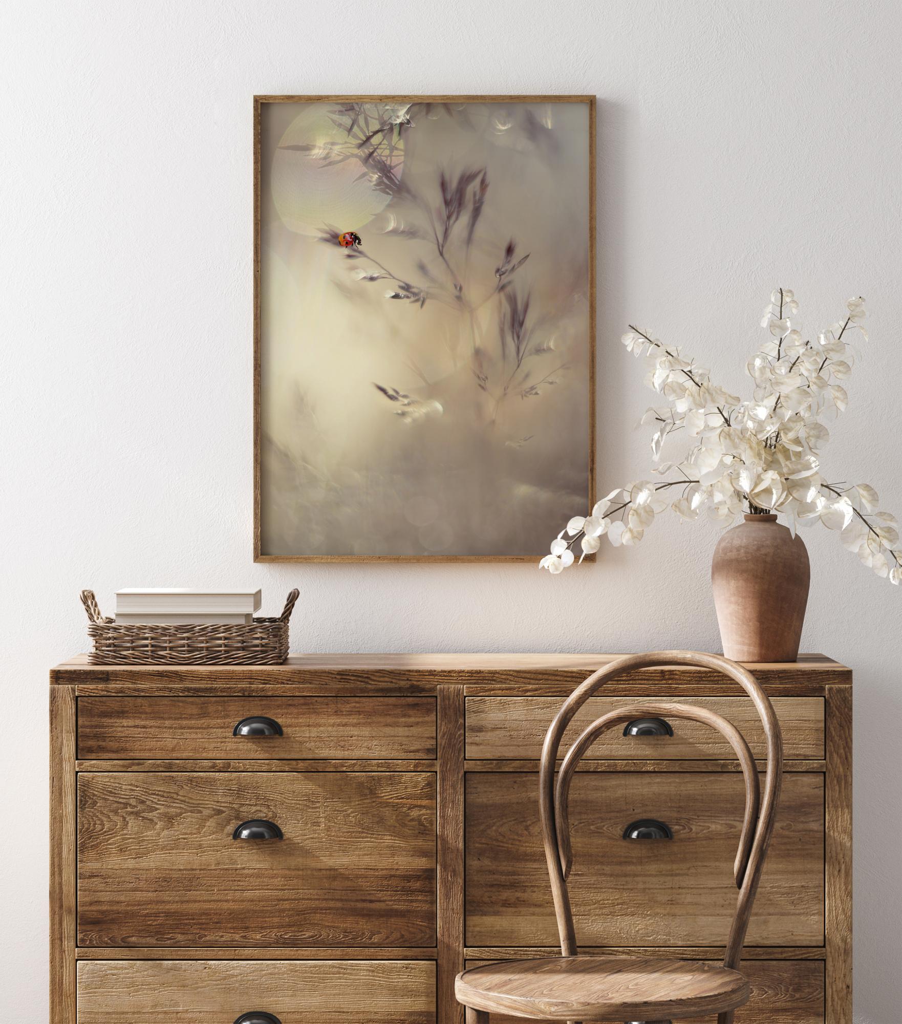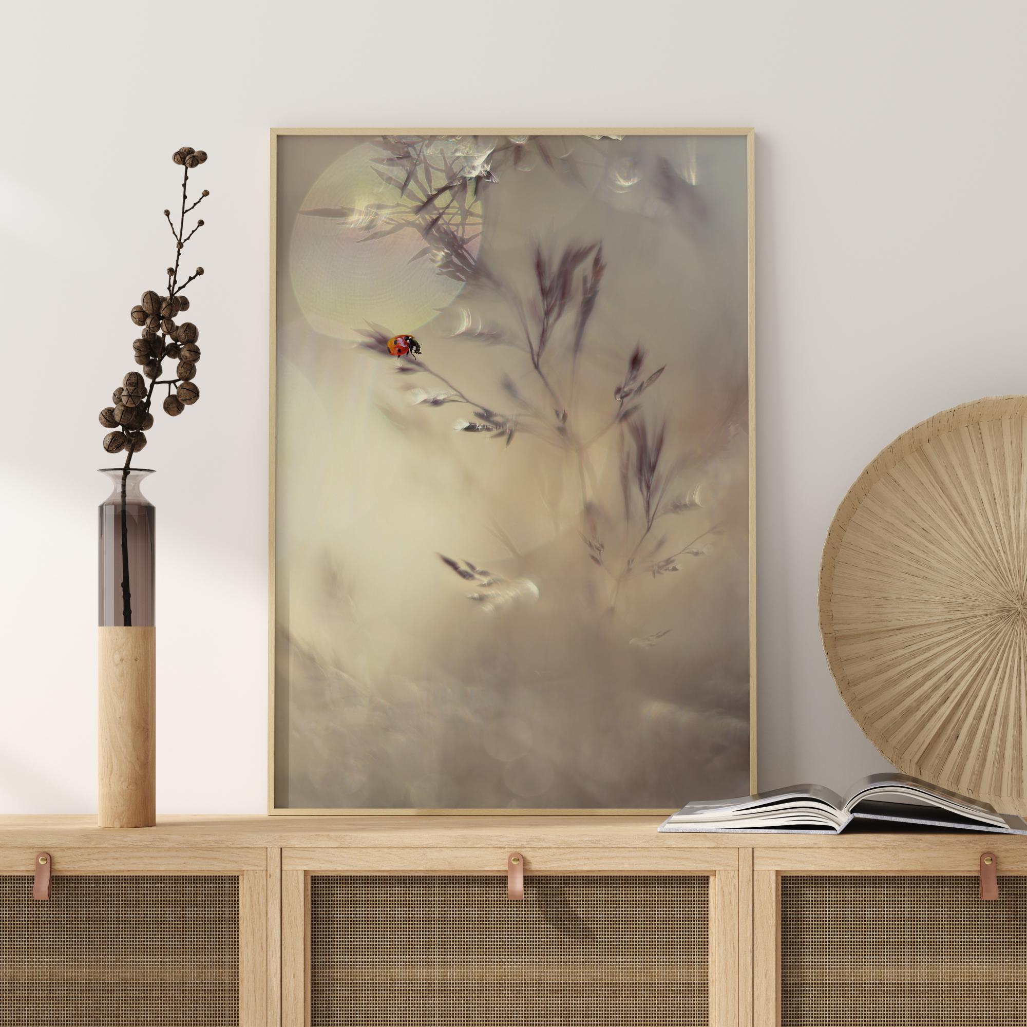 Mlhavý plakát s krásnou beruškou na suché trávě. Se slunečním světlem odráženým v dálce jsou jasně vidět silné černé a červené barvy berušky. Krásné, mlhavé barvy zprostředkovávají pocit klidu a míru. Krásný tisk k zavěšení do ložnice.