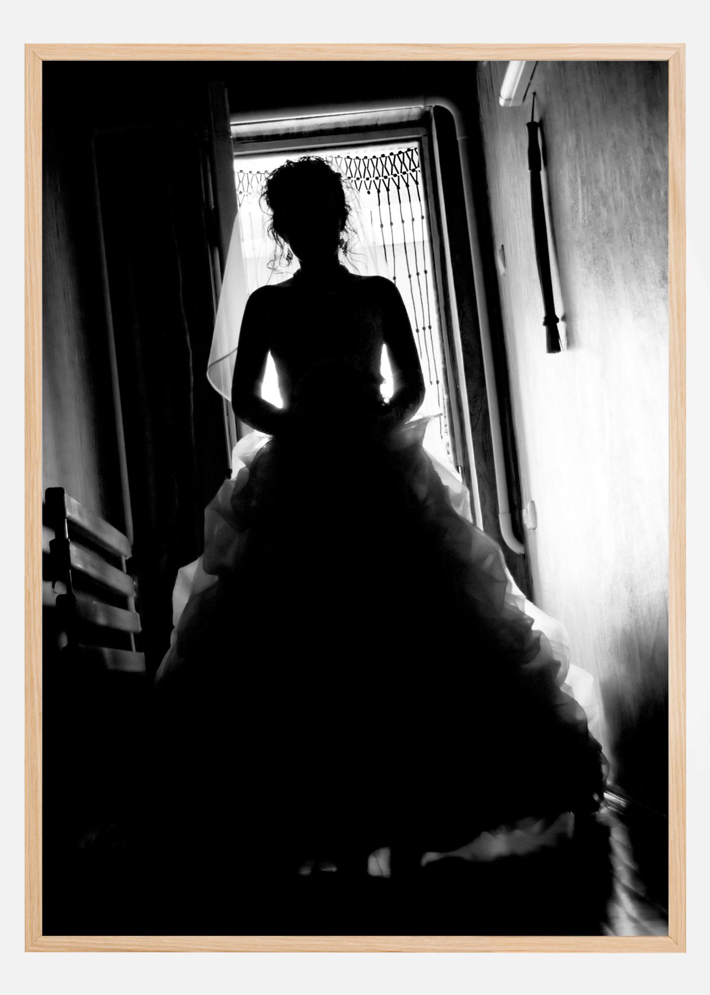 Fotografické umění v tmavých odstínech šedi zobrazující nevěstu fotografovanou proti světlu. Tmavý a neostrý plakát, který vzbuzuje zájem a zvědavost. Kombinujte s jinými oblíbenými díly pro větší, živější galerii na stěně.