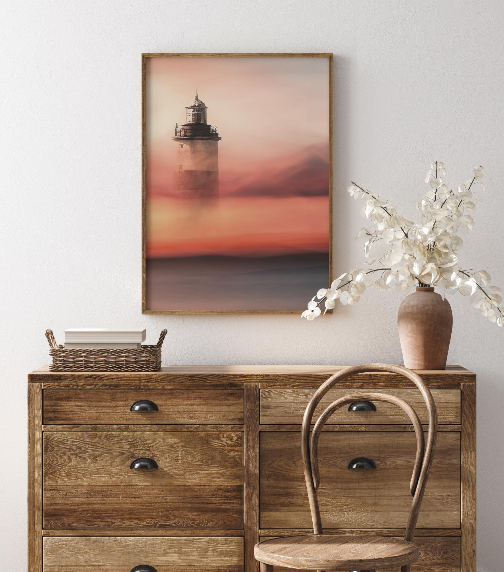 Krásný romantický tisk majáku v mořské mlze. Jemné růžové pastelové barvy vytvářejí pocit romantiky, zatímco jemně modré moře přidává temnější tón k tomuto krásnému plakátu. Cítíte a slyšíte mořský vánek, když pověsíte tento obrázek ve vašem domově.