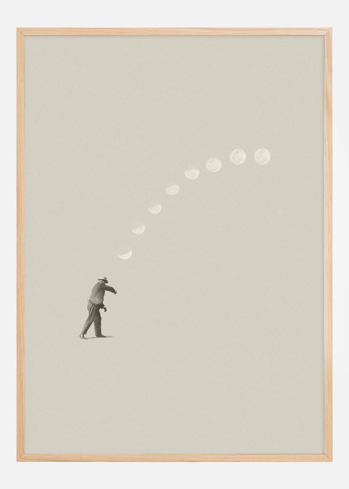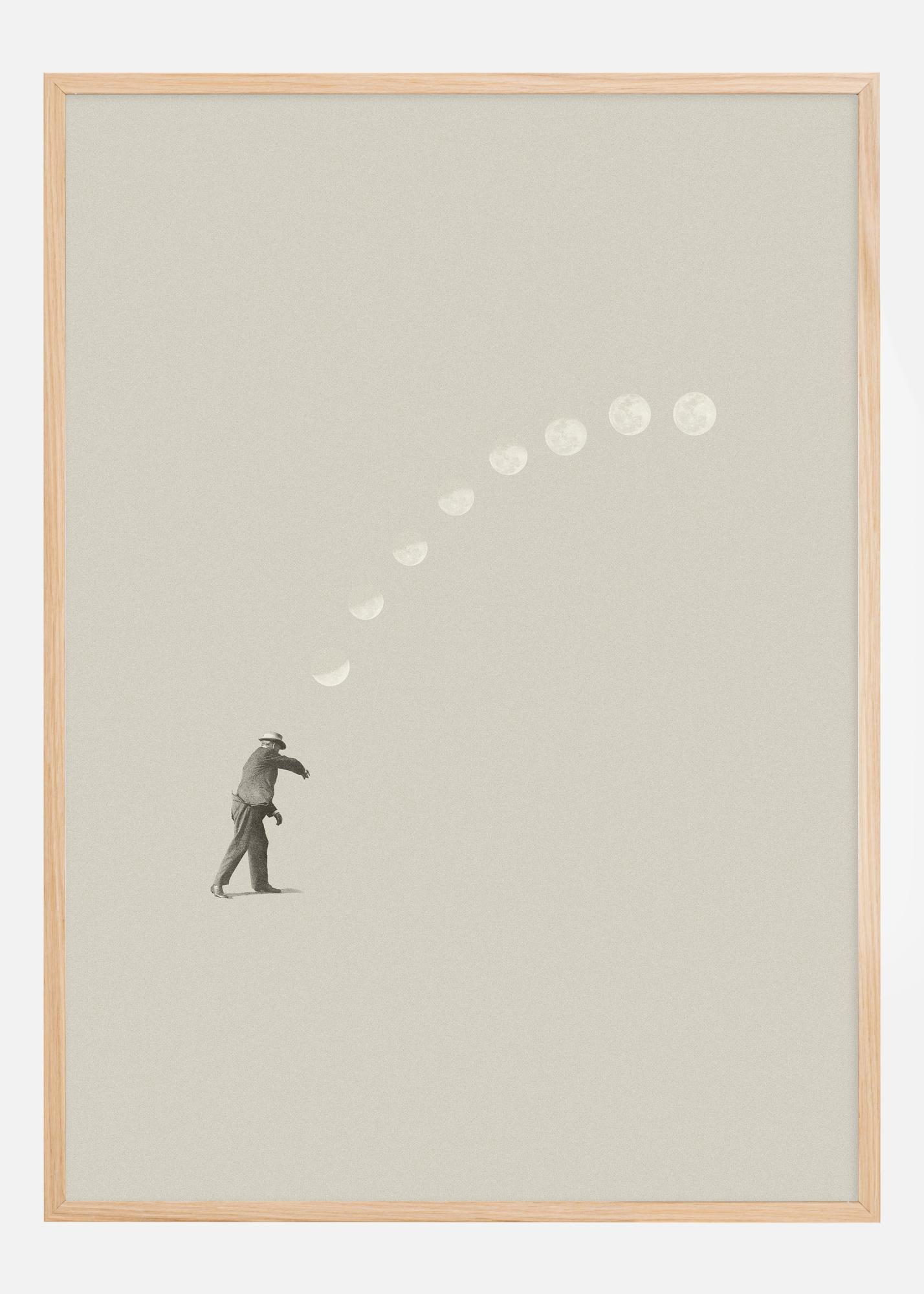 Tento poetický plakát zobrazuje siluetu muže, který mocným pohybem vrhá měsíc k obloze. Je to scéna, která zachycuje okamžik, kdy je měsíc elegantně vyslán a vytváří dráhu různých měsíčních fází. Tento čin možná symbolizuje sny a ambice směřující k nekonečným možnostem. Minimalismus obrazu posiluje tuto mocnou gesto a ponechává prostor pro diváka, aby doplnil vlastní příběh a význam.