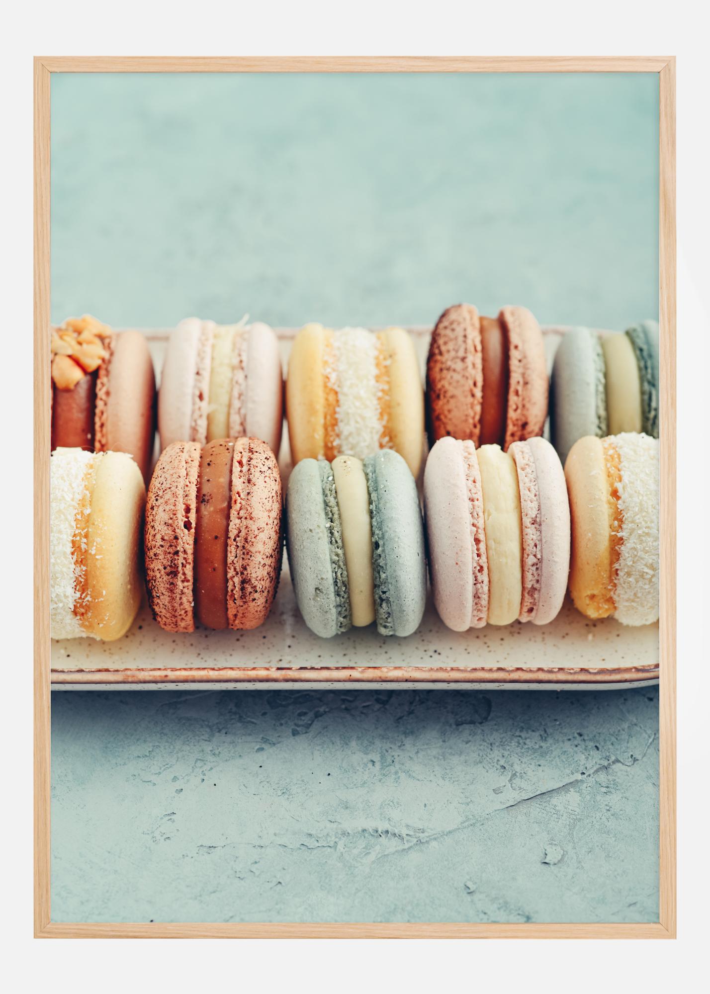 Tento barevný a lákavý plakát zobrazuje řadu delikátně uspořádaných makronek, jejichž rozmanité barvy a textury vytvářejí vizuální hody. Jemné pastelové barvy se pohybují od bledě citronové po bohatě karamelovou a pudrově růžovou, každá makronka je zvýrazněna detaily jako posypka a kokosové vločky, což zvyšuje její vzhled a předpokládanou chuť.
