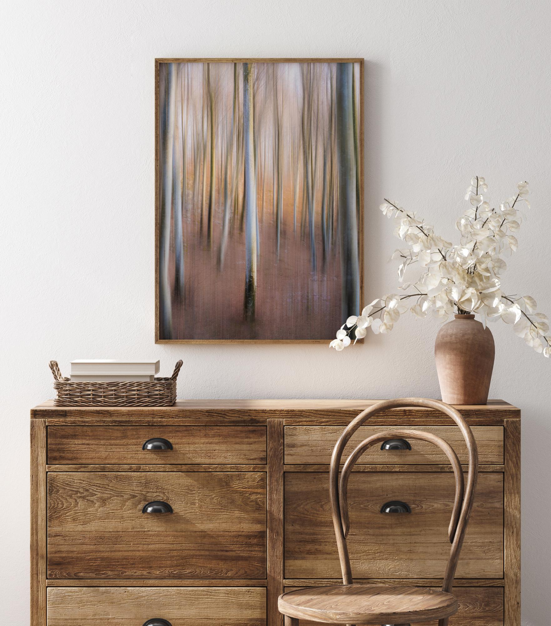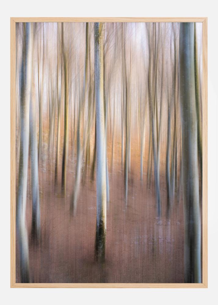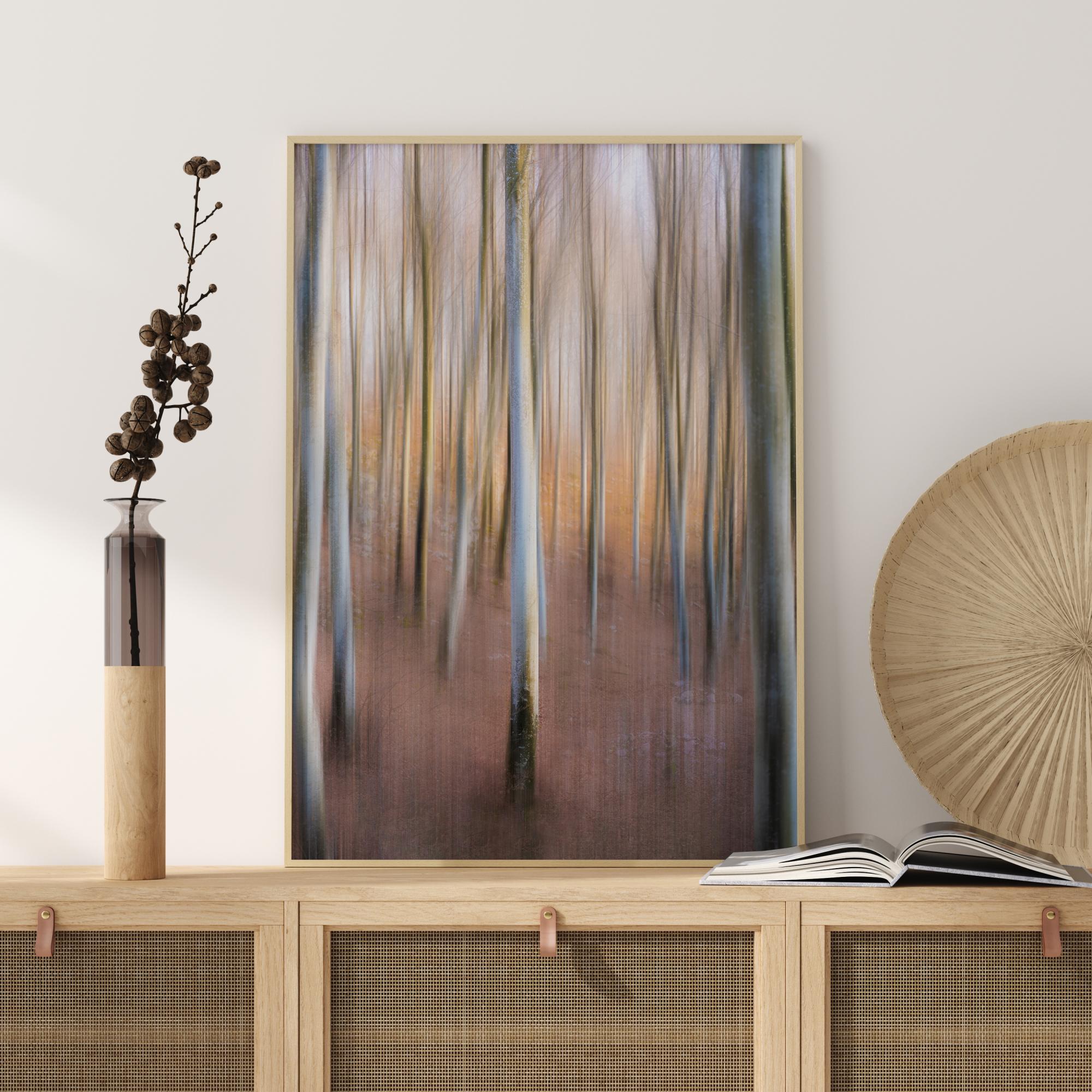 Krásný, ale tajemný plakát s magickým lesním pozemkem. S přirozeným světlem, které prosvítá stromy, magické pastelové barvy zvýrazňují vysoké kmeny stromů. Uslyšte ticho lesa, když pověsíte tento obrázek ve svém domově.