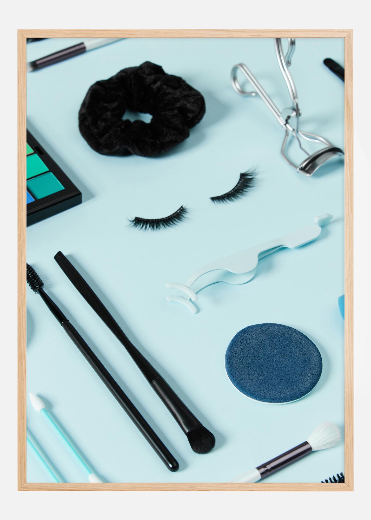 Barevná paleta je ovládána jemnými a uklidňujícími odstíny modré, které jsou doplněny černou a stříbrnou, což poskytuje čerstvý a současný vzhled. Realistické detaily make-up štětců, kleští na řasy a umělých řas krásně kontrastují s minimalistickým pozadím, a struktura černé gumičky dodává zajímavý vizuální prvek. Tento tisk bude skvělým doplňkem do koupelny, na toaletní stolek nebo na jakékoli místo, kde jsou krása a styl nejdůležitější. Je ideální pro inspiraci a zkrášlení vaší každodenní kosmetické rutiny.