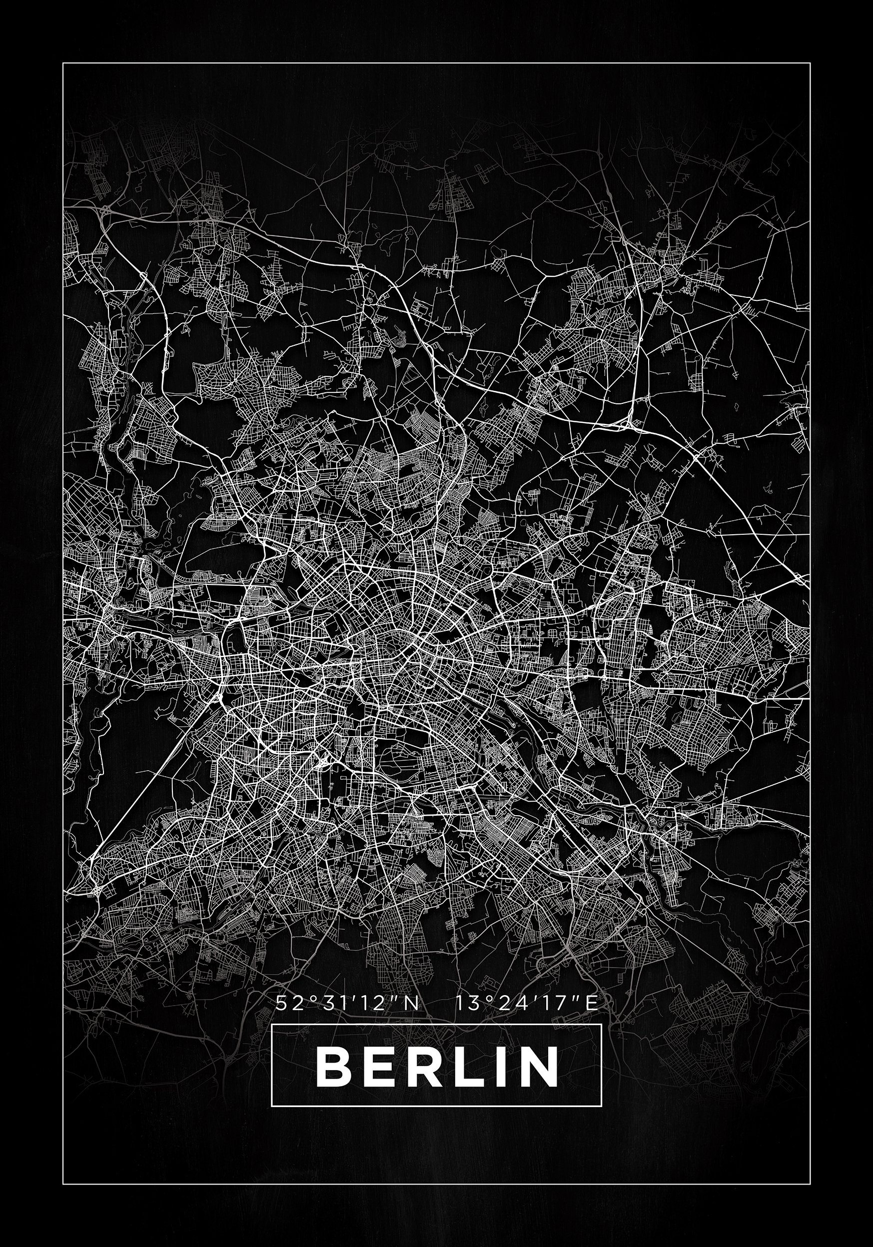 Hledáte-li poctu Berlínu, je tohle perfektní volba! S ulicemi a náměstími v bílé barvě na černém pozadí se zde městská mapa stává dokonalým poutačem. Na spodní části obrázku jsou vytištěny souřadnice města, těsně nad názvem města, který je napsán velkými písmeny. Berlín, jak název, tak mapa, je elegantně orámován tenkou bílou linií. Městská mapa je pak obklopena širokým černým okrajem, který vytváří stylový prostor mezi rámem a obsahem plakátu. Silný a zároveň elegantní mapový plakát, který slouží jako dokonalý interiérový prvek!