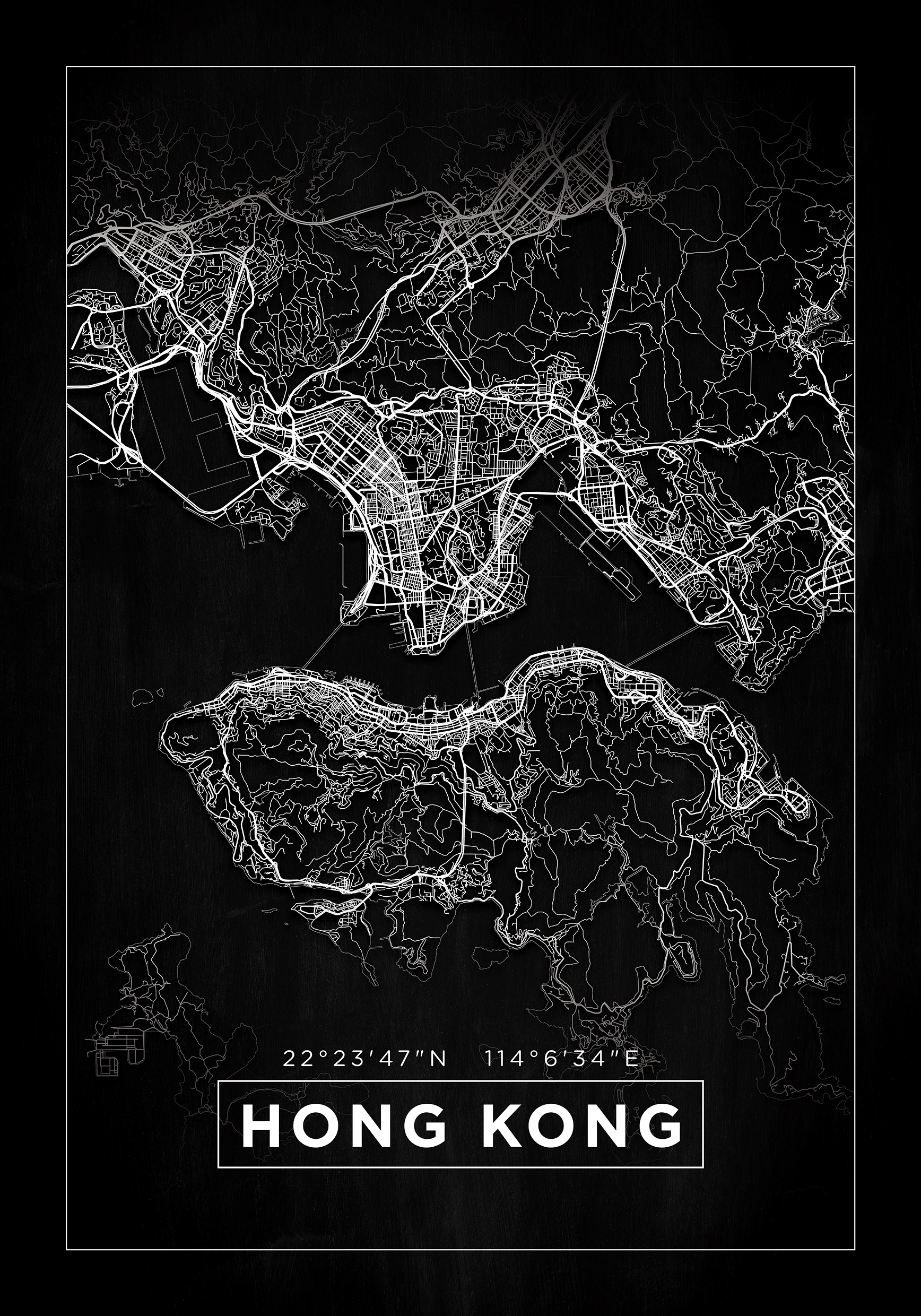 Zde máme mapu města Hongkong, která může být perfektním dárkem pro vás samotné nebo pro někoho, koho znáte a kdo nosí toto město blízko svého srdce! Na bílé jsou vyraženy ulice a náměstí proti černému pozadí. Na severu a jihu se mapa rozplývá a dole na obrázku je Hongkong orámován bílými verzálky. Nad rámem jména jsou čísla, která udávají souřadnice geografické polohy města. Mapu obklopuje stejný rám jako jméno města a vně něj je širší černý okraj, který efektivně pomáhá zachytit a přivést pohled do obsahu obrazu. Nádherný plakát s mapou, který skutečně přitahuje pozornost!