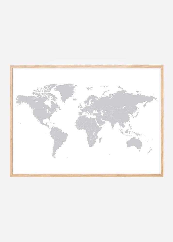 Grafický tisk mapy světa v příjemné šedé barvě, který se hezky zavěsí společně s ostatními plakáty na stěně s obrazy. Elegantní tisk se hodí do všech typů prostředí, jak veřejných, tak domácích. Díky výběru rámu, který plakát doplní, může zapadnout do všech stylů interiéru a barevných schémat. Plakát je vděčný dárek k darování tomu, kdo potřebuje ozdobit stěny.