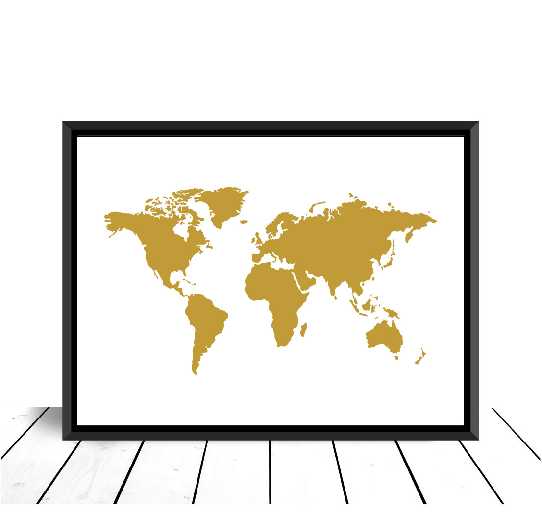 Grafický tisk pro světovce nebo cestovatele, kteří chtějí se chlubit. Jednoduchá ilustrace mapy se stylizovanou světovou mapou ve zlatě na bílém pozadí. Hodí se stejně dobře do všech místností v domě. Umístěte plakát spolu s dalšími obrazy na téma cestování nebo použijte k označení všech míst, která jste navštívili po celém světě.