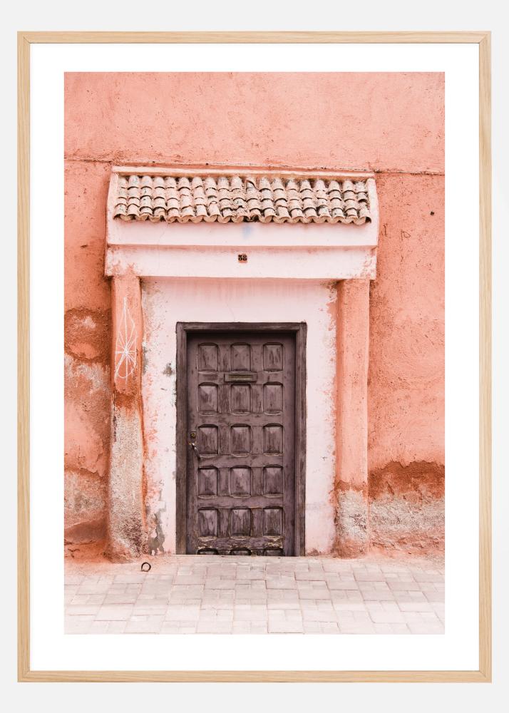 Krásný broskvový a hnědý tisk hnědých dřevěných dveří. Marocký dům je natřen v krásném broskvovém tónu. Bílá zeď obklopující dveře dodává portrétu extra dotek světla. Zavěste tento krásný broskvový plakát na béžovou zeď, abyste vytvořili pocit harmonie.