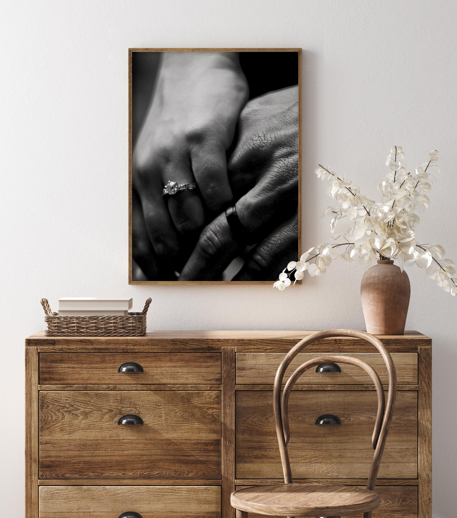 Romantický černobílý tisk dvou rukou, které nesou prsteny. Silný a emotivní obraz na tmavém pozadí. Přirozené světlo osvětluje malý diamantový prsten. Romantický plakát k zavěšení na stěnu v ložnici.