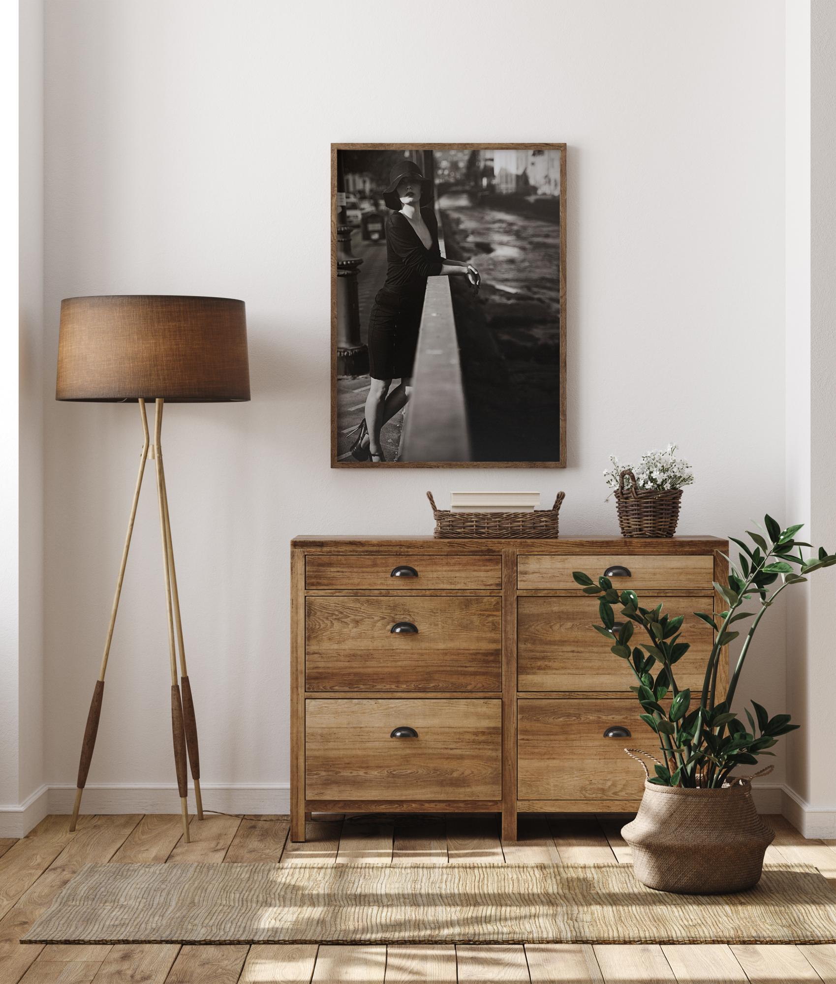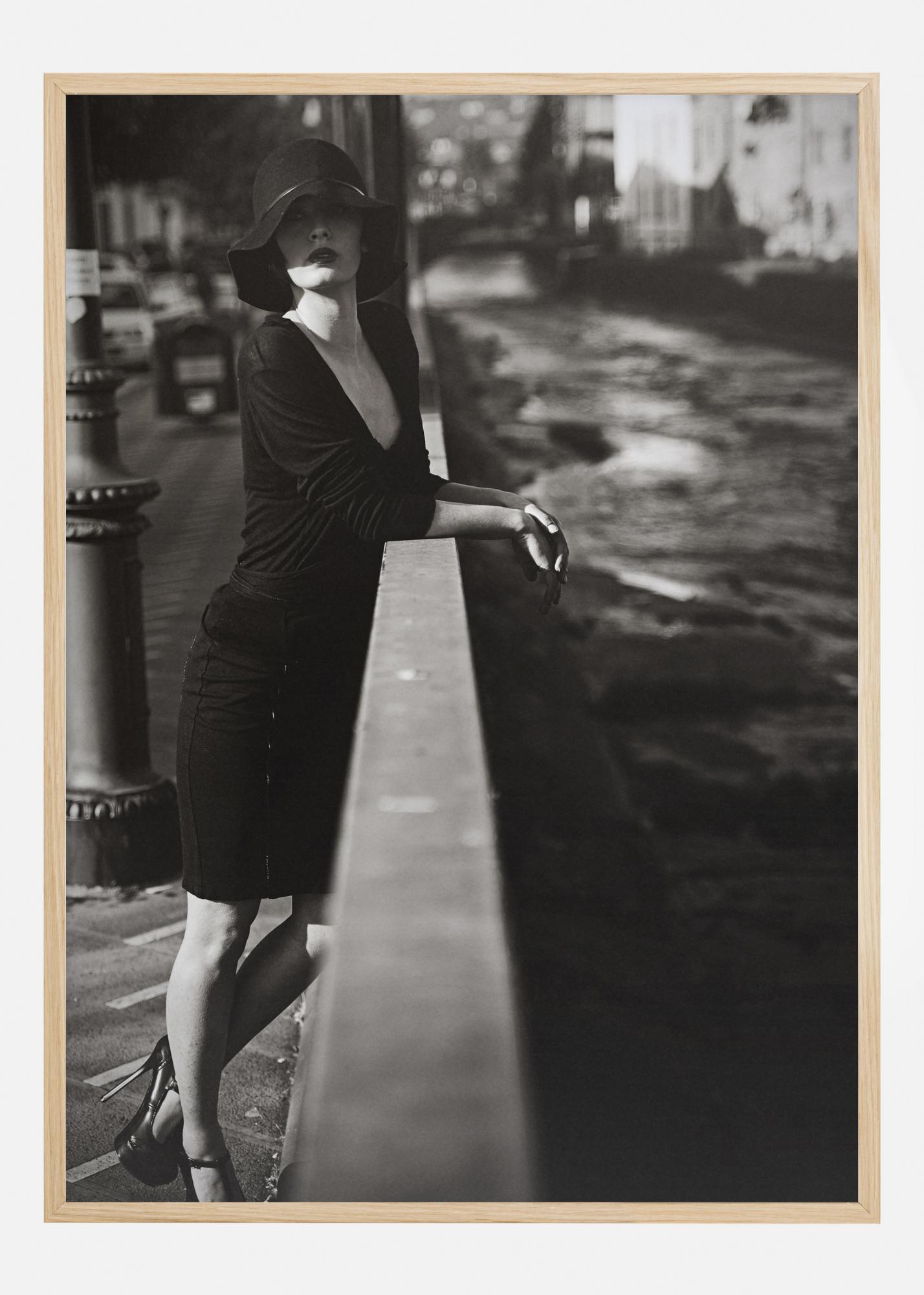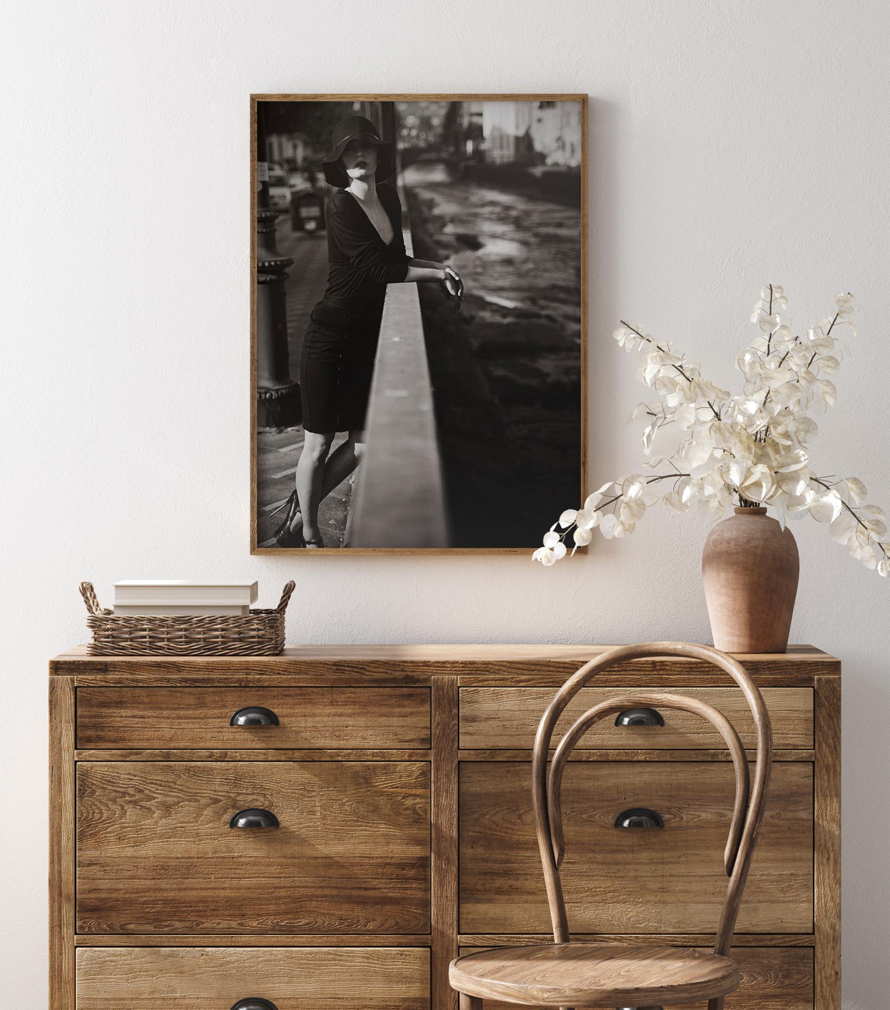 Portrét ženy opírající se o zeď. Tato úžasná fotografie vyzařuje třídu a zachycuje uvolněnou eleganci jako žádná jiná. Zavěste tento plakát na stěnu a dodejte prostoru příjemný pocit třicátých let.