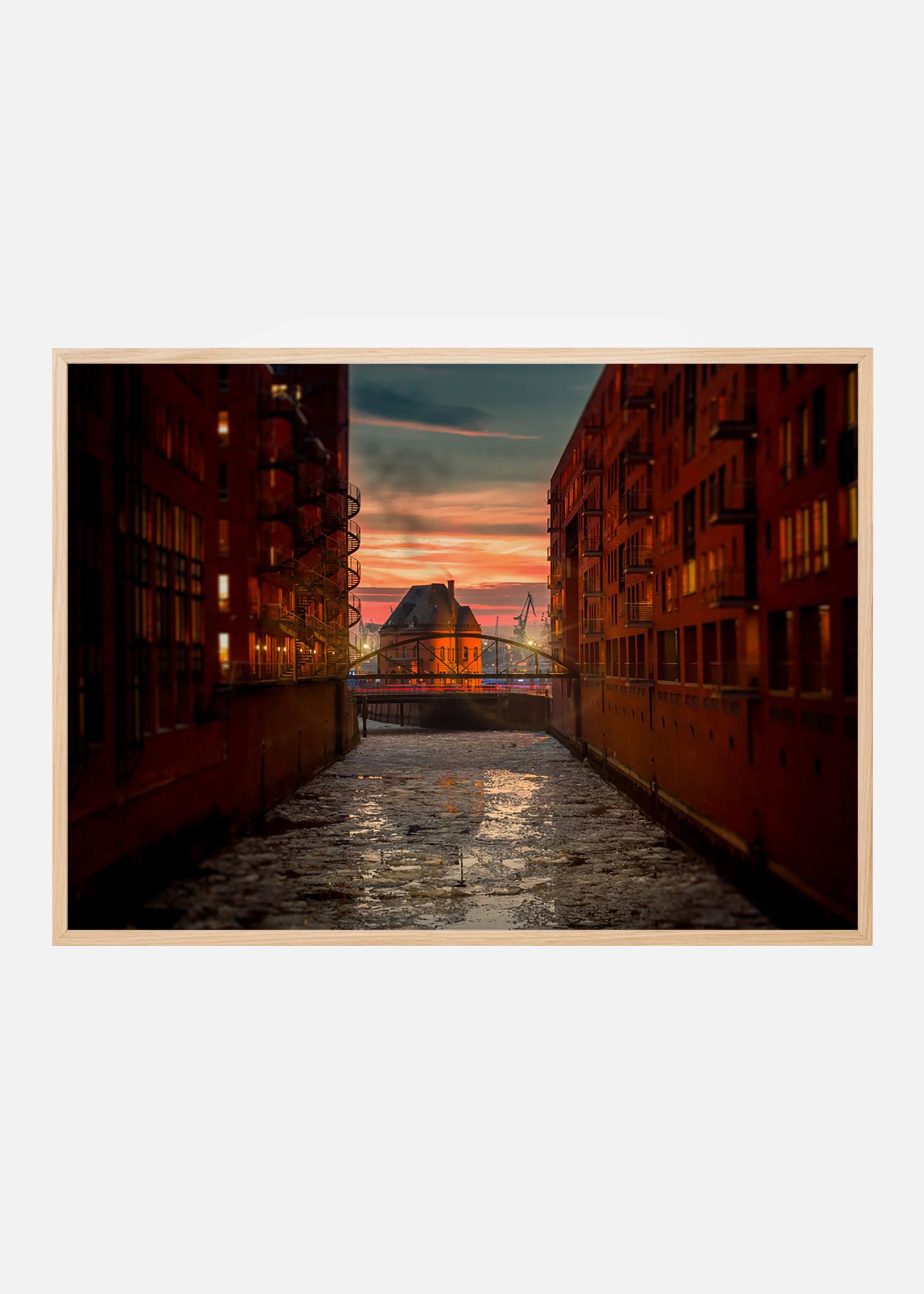 Západ slunce nad starou skladovou čtvrtí Speicherstadt v Hamburku s jejími kanály a novogotickými cihlovými budovami. Fotografie z architektonicky chráněné oblasti se krásně hodí do domácnosti zájemců o architekturu nebo historii. Plakát se nejlépe vyjímá v tenkém kovovém rámu, který ladí s přísnou architekturou a vypadá hezky na zdi spolu s dalšími městskými snímky.