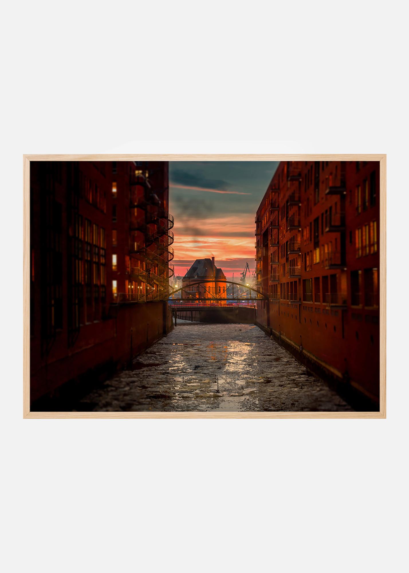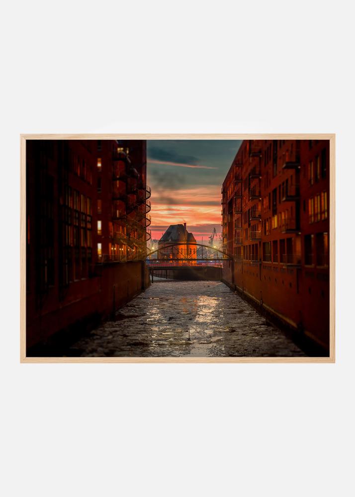 Západ slunce nad starým skladištním okrskem Speicherstadt v Hamburku s jeho kanály a novogotickými cihlovými budovami. Fotografie z této chráněné oblasti krásně doplní domov zájemců o architekturu nebo historii. Plakát se nejlépe vyjímá v tenkém kovovém rámu, který ladí s přísnou architekturou, a vypadá skvěle na zdi spolu s dalšími městskými obrazy.