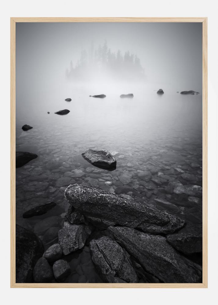 Mystický přírodní plakát s kameny a mlhavým jezerem. Představte si, co se tam venku nachází, když se díváte na mlhavý ostrov pokrytý stromy. Udělejte svůj domov magickým s tímto úžasným tiskem na modré stěně.
