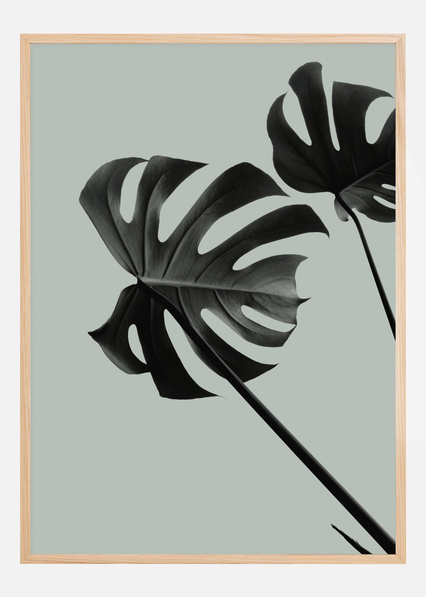 Černobílá detailní fotografie dvou listů monstera. Listy ve tvaru srdce jsou vidět na matně šedém pozadí a okamžik je zesílen světlem za pírkovými vzory. Tento plakát je perfektní pro přinesení vzrušujícího pocitu těchto srdcovitých listů do vašeho domova.