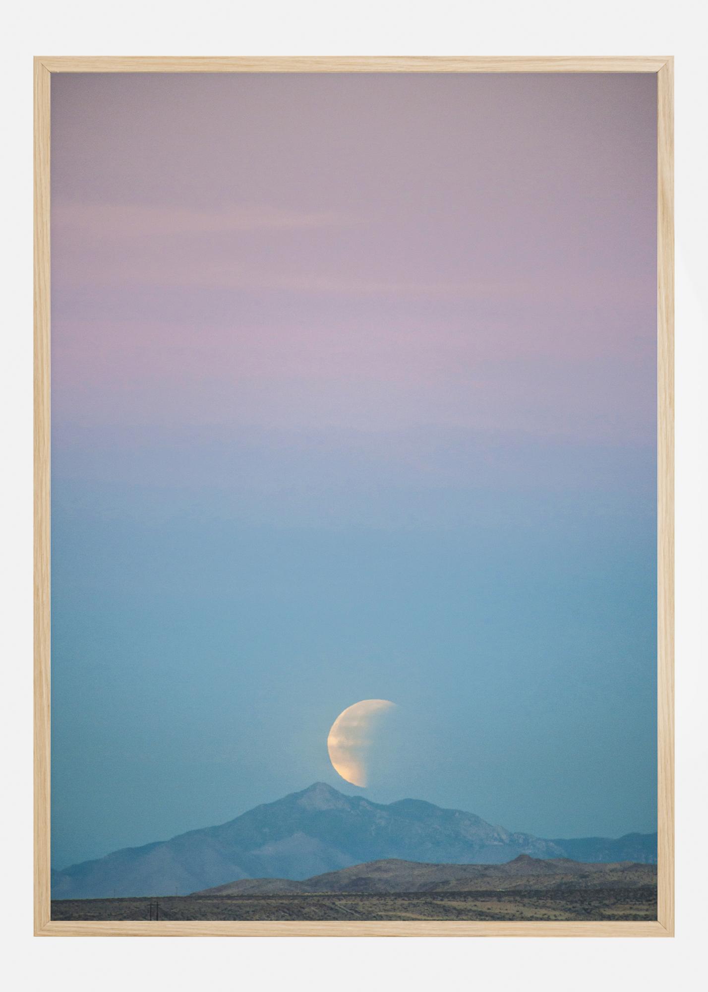 Scénický plakát s měsícem na vrcholu hory. Obloha přechází z barvy zeleného pozadí do barvy růžového popředí. Elektrické sloupy jsou vidět v kopcovitém popředí. Přineste krásu úžasných výhledů matky přírody do svého domova.