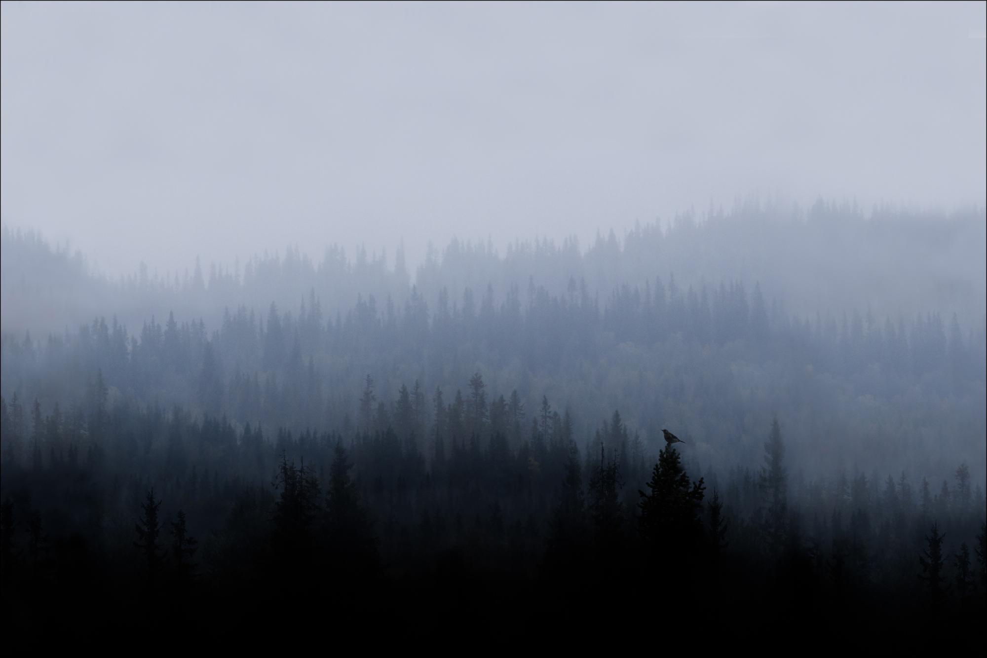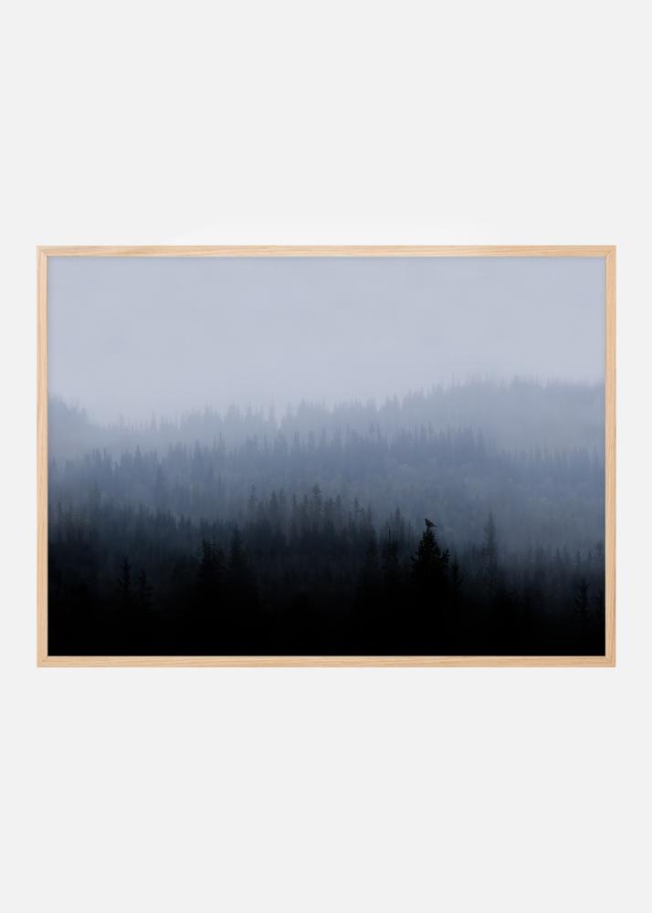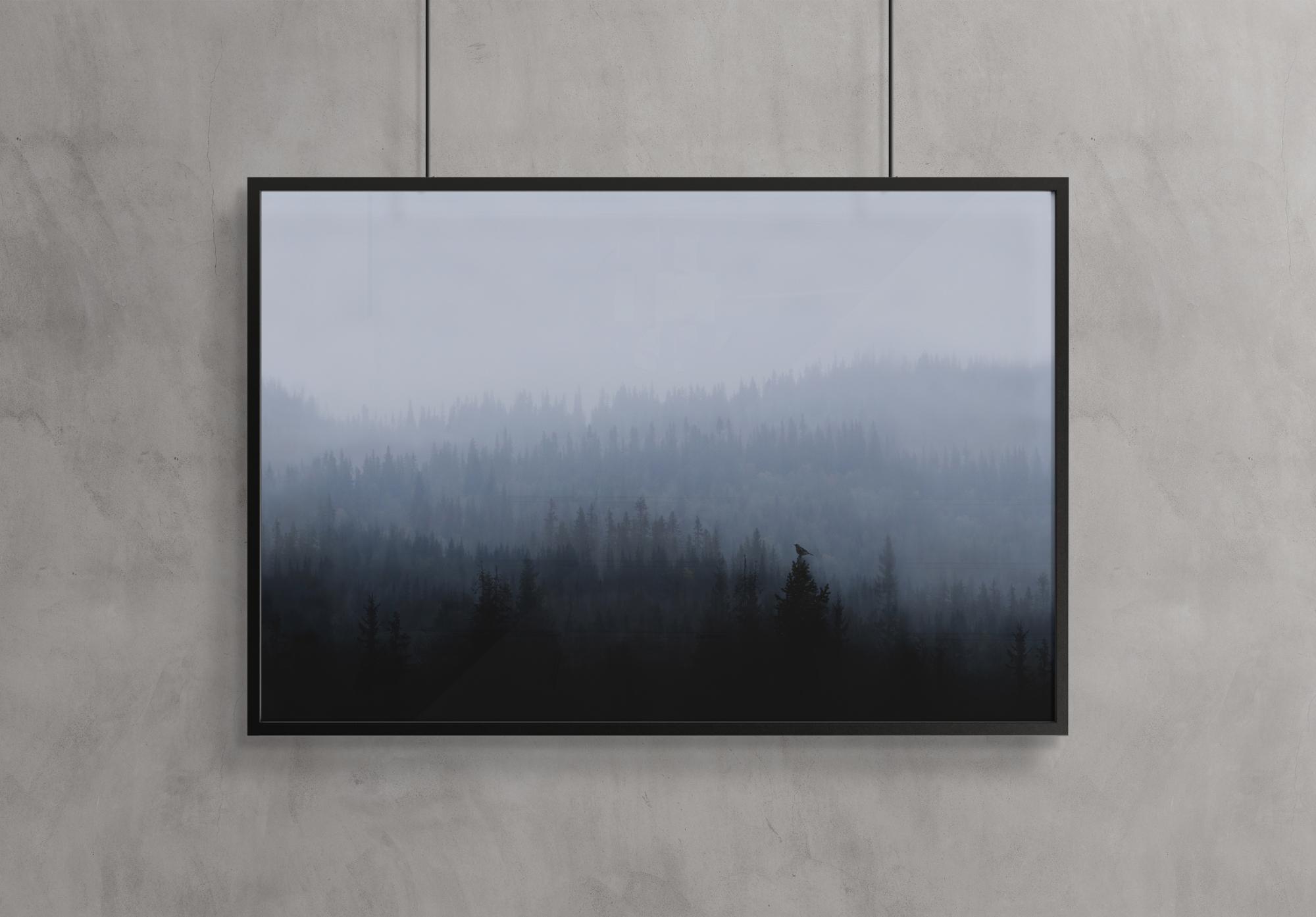 Plakát s chladným ránem na mlhavém lesnatém svahu. Ranní pták sedí na vrcholu stromu v popředí, zatímco na horizontu v kopcovitém pozadí je vidět světlo. Černobílý obraz přináší zimní pocit do vašeho domova.