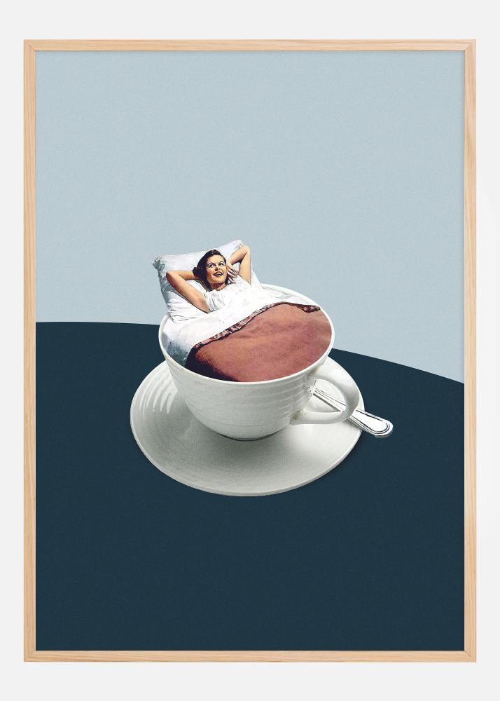 Tento originální a fantazijní plakát zobrazuje ženu, která si zdánlivě užívá odpočinkový okamžik v neobvyklém prostředí: leží pohodlně v bílé šálku naplněné kávou, obklopena uklidňujícím modrým prostorem, který naznačuje úsvit nového dne. Velikost šálku ve vztahu k ženě vytváří surrealistický dojem a její uvolněné pozice v ložním prádle dodávají scéně nádech každodenního pohodlí a humoru.