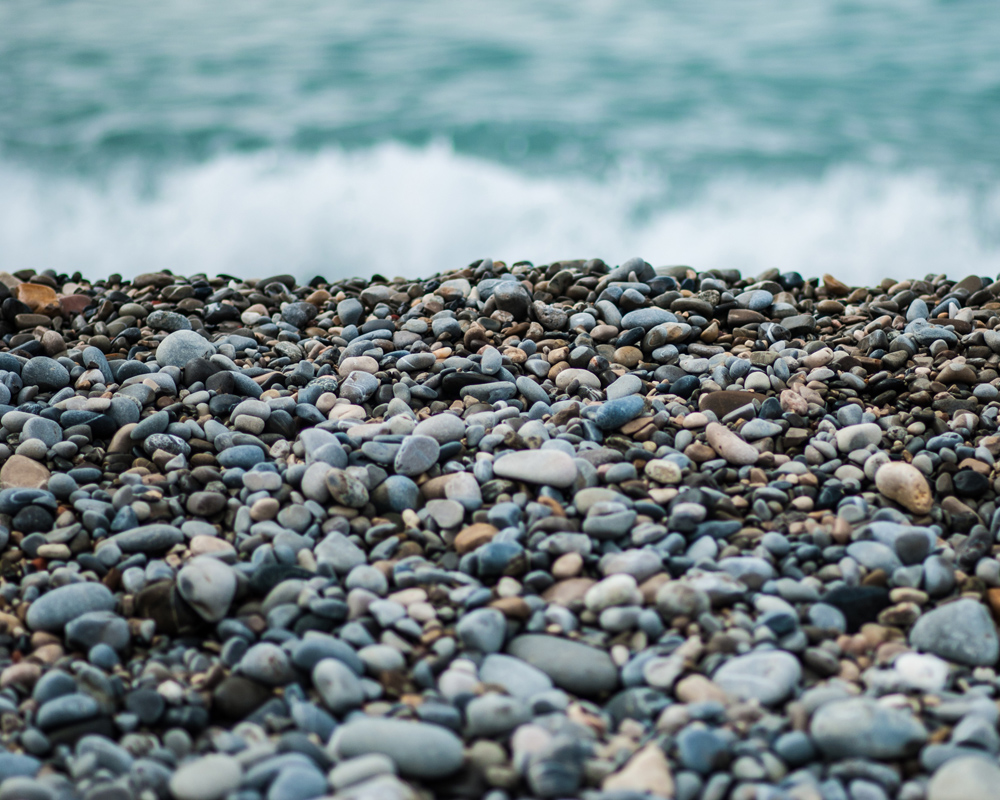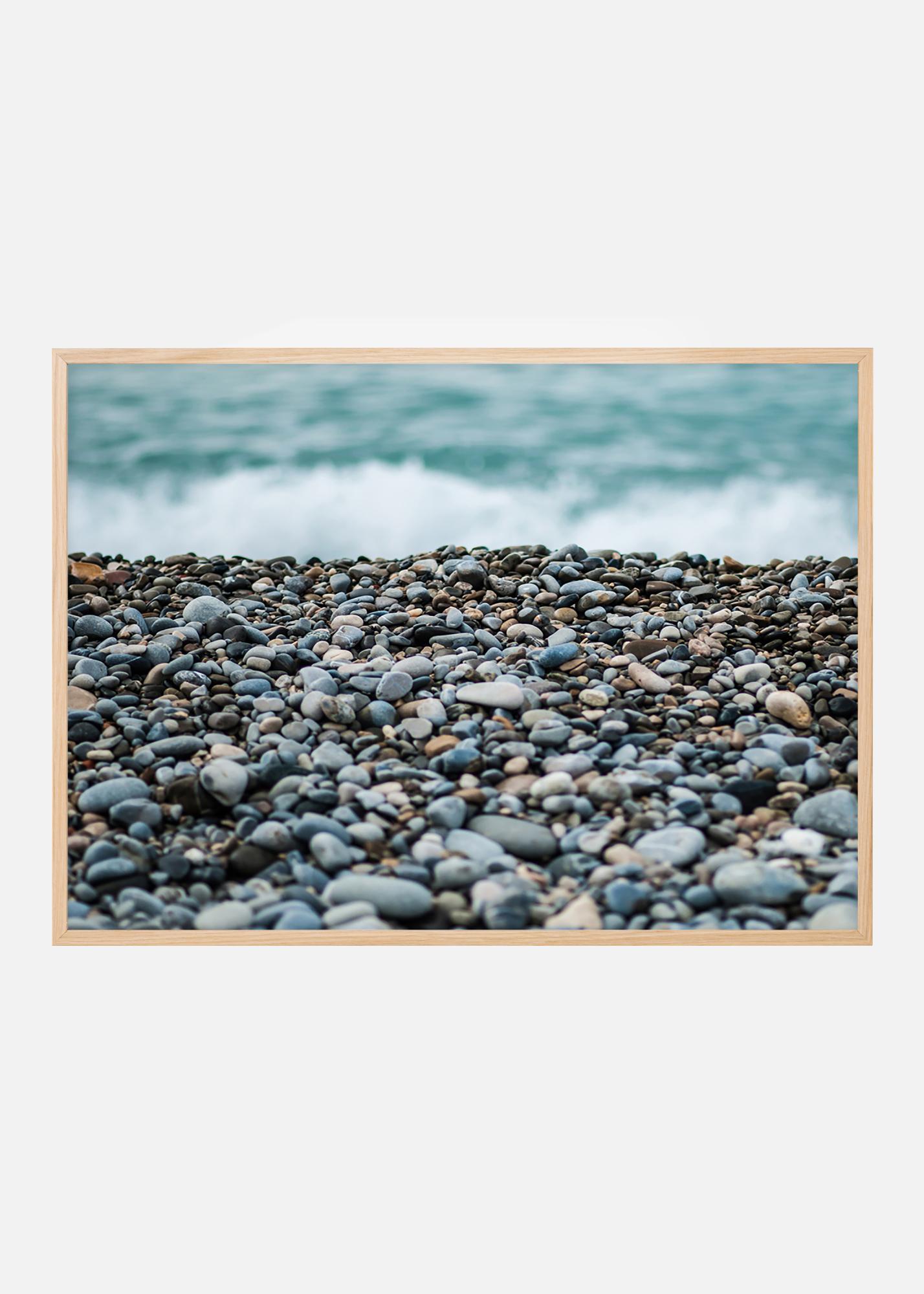 Slyšte šum mořských vln z tohoto plakátu s krásnou kamennou pláží v popředí. Krátká hloubka ostrosti vytváří zajímavý obrázek, který přitahuje oči do obrazu. Najdete mezi kameny nějaký zaoblený kus skla? Šedě modrá barevná škála vypadá dobře s úzkým rámem na světlé stěně, ideálně s námořními doplňky.