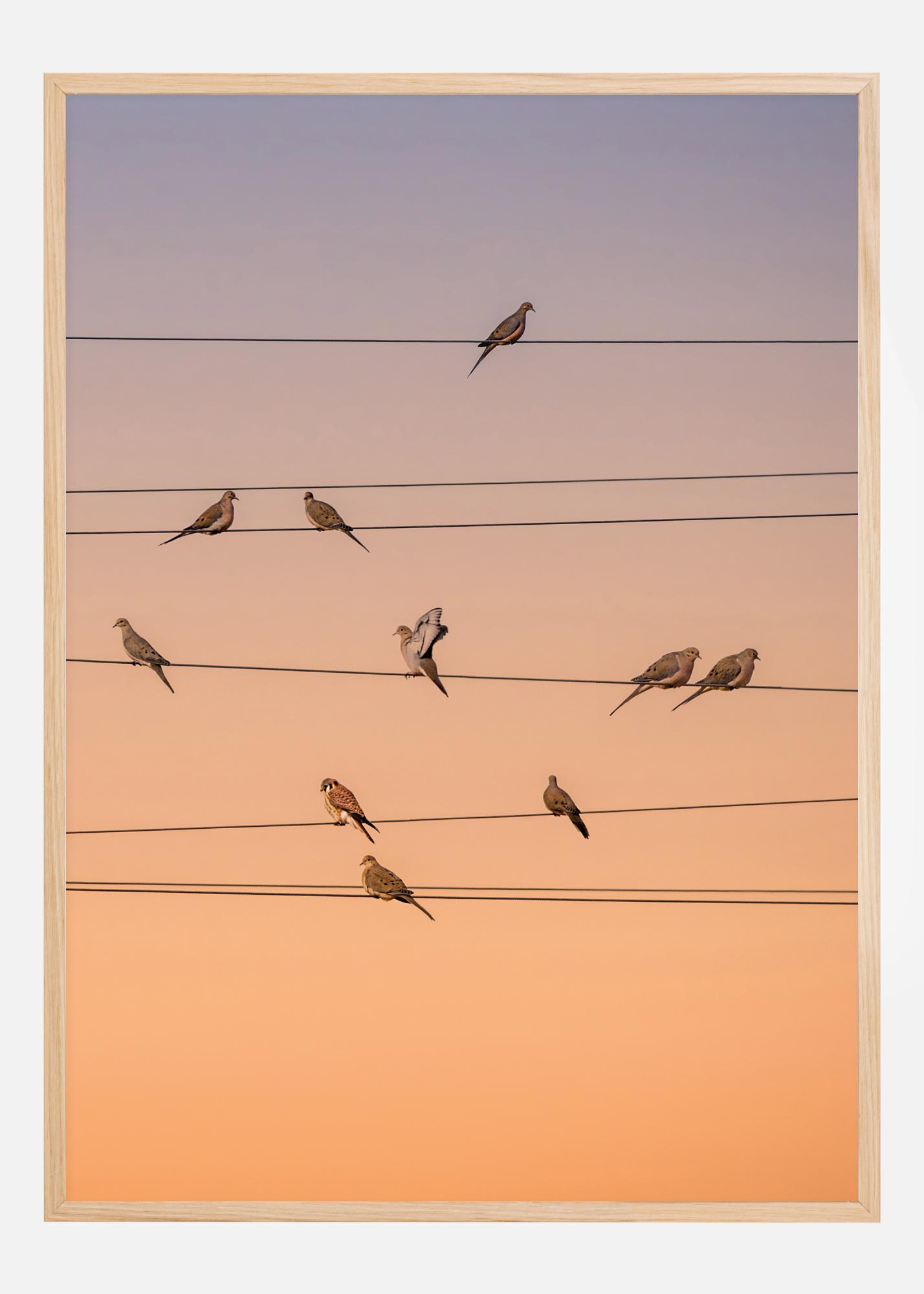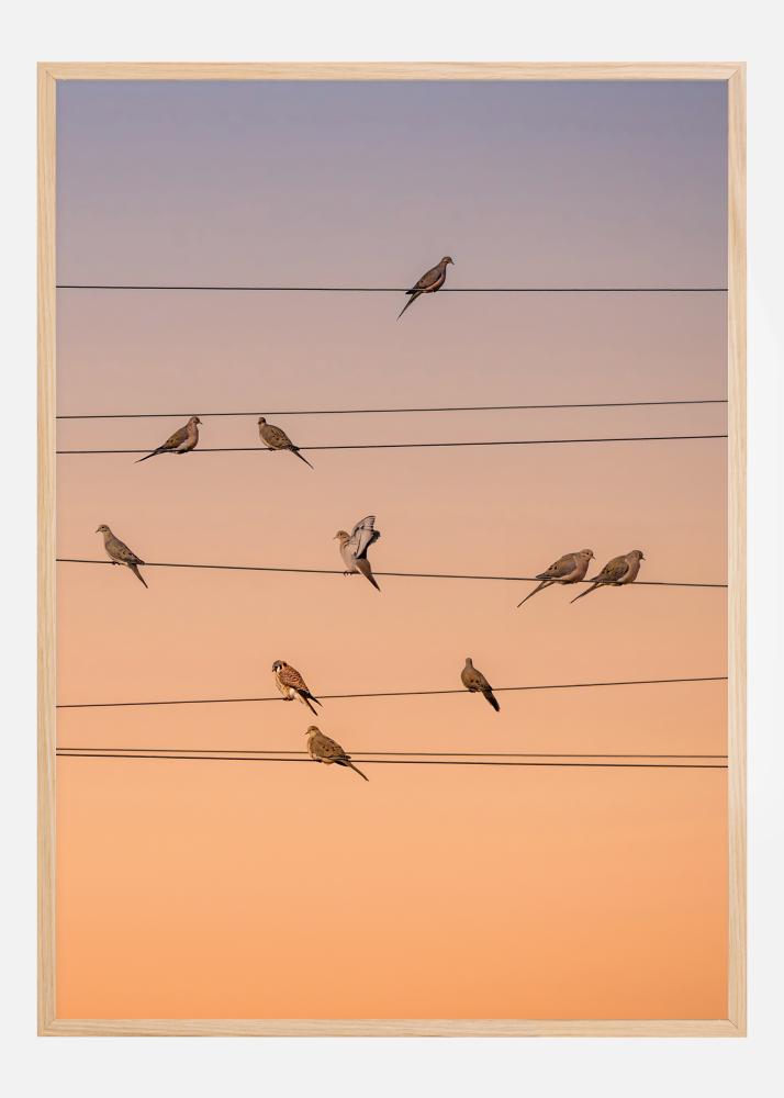 Úžasný plakát s ptáky sedícími na elektrických vedeních v oranžovém západu slunce. Ptáci a elektrická vedení připomínají notový záznam, který evokuje ptačí zpěv. Tento obrázek se dobře hodí na všechny obývací stěny.