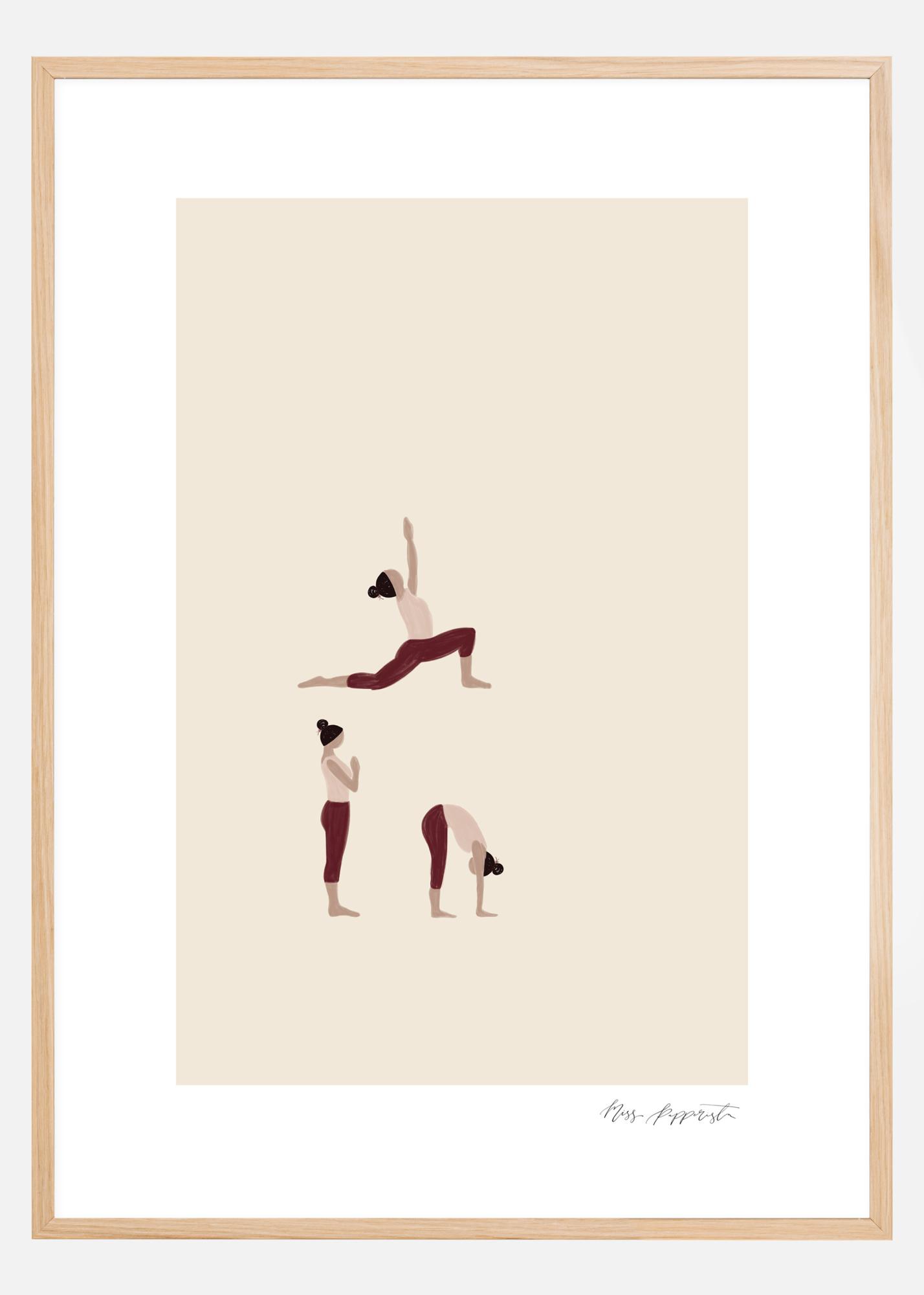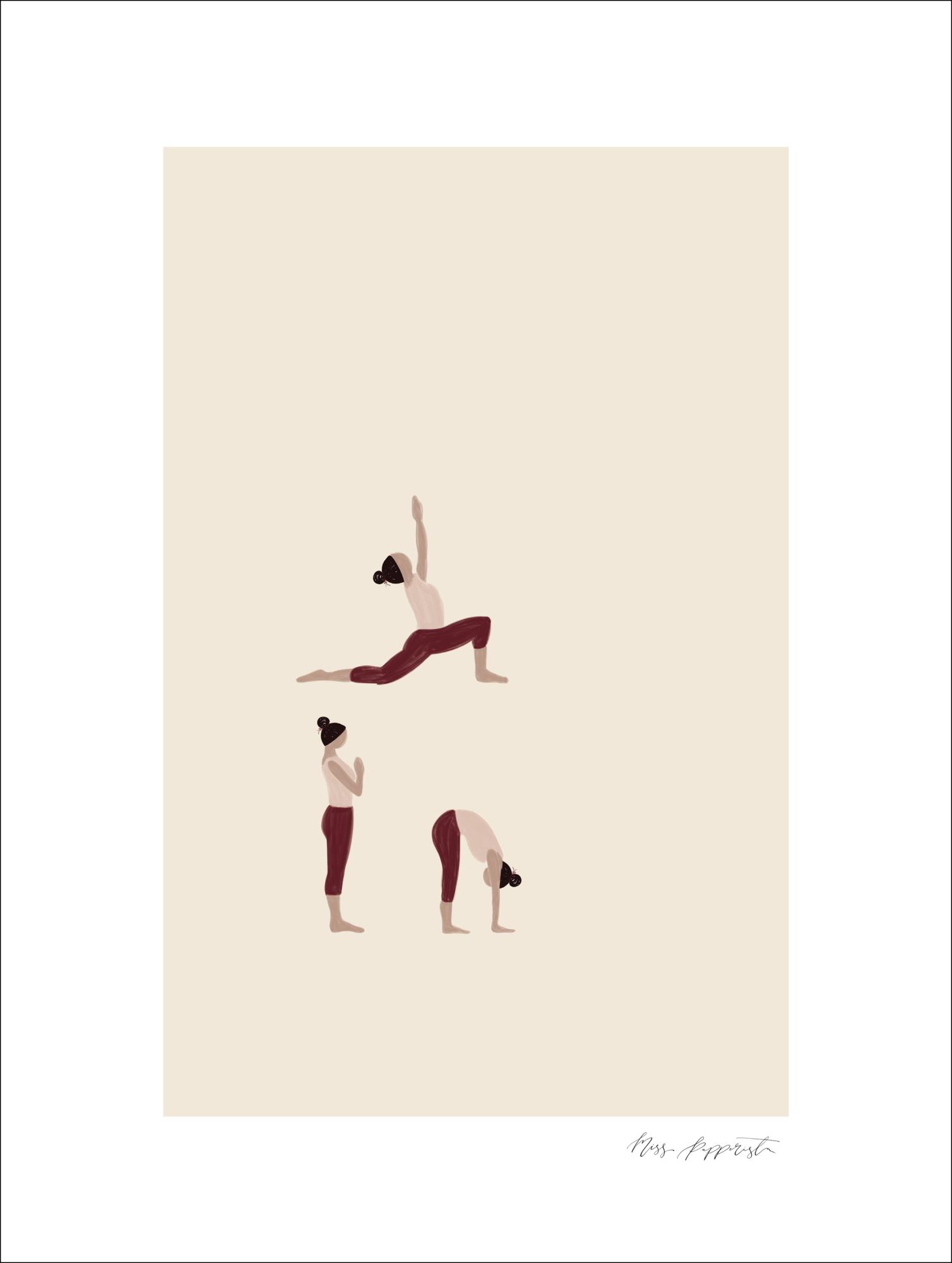 Umělecké dílo s ženou, která cvičí jógu. Na krémovém pozadí žena stojí ve třech různých pozicích. Všechny pozice jsou provedeny ženou dokonale. Perfektní plakát k zavěšení ve třídě jógy nebo v posilovně.