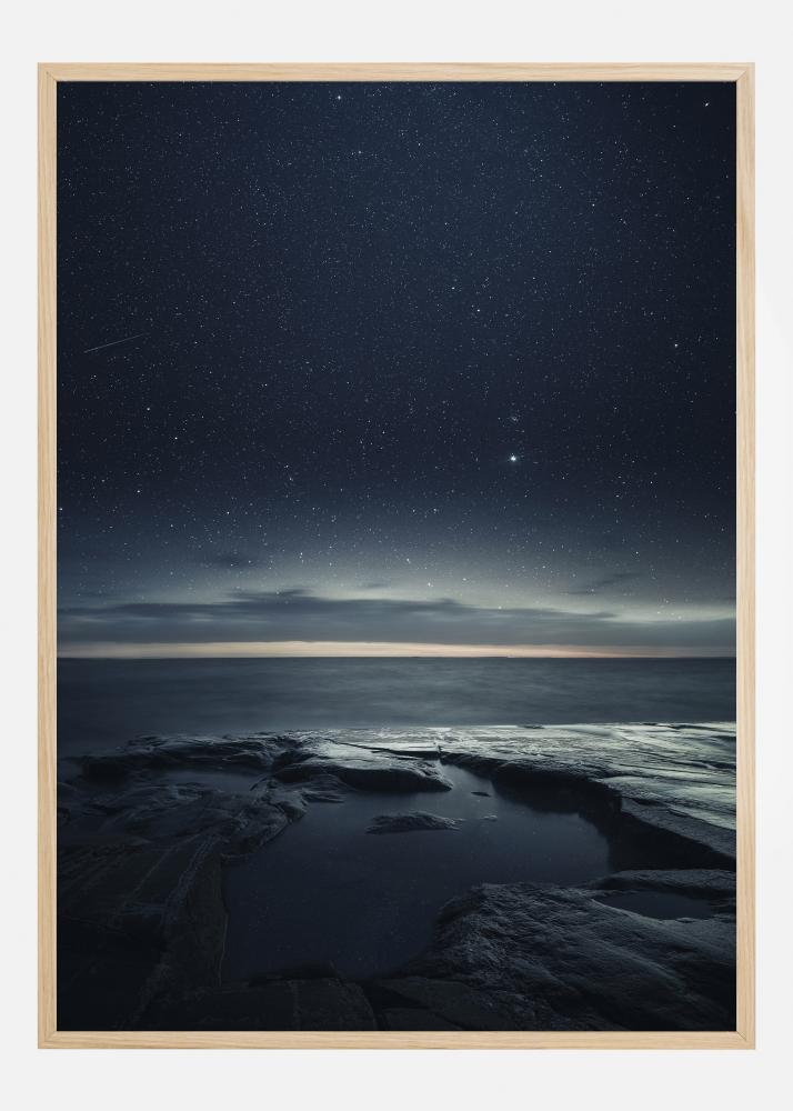 Úžasný potisk skalnaté pláže s vodou odrážející čistou, fialovou oblohu s třpytícími se hvězdami. Horizont je jasně viditelný díky bílému paprsku, který se táhne přes moře. Toto je vzácný plakát s večerní magií, připravený dodat vašemu domovu trochu šmrncu.