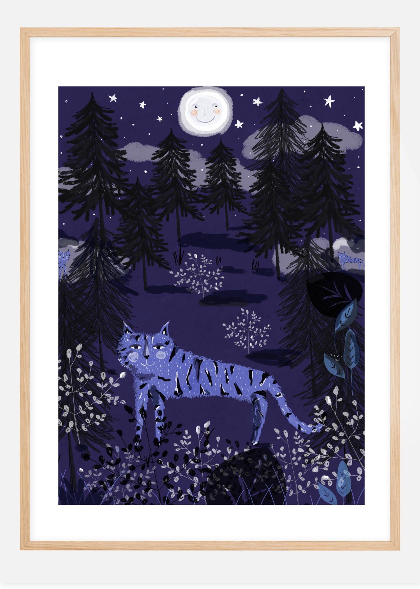 Vtipný plakát, který zobrazuje les v noci s usměvavým měsícem a tygrem. Fialová obloha je plná mraků a třpytivých hvězd. V pozadí stojí vysoké borovice, zatímco měsíc na ně shlíží. Tmavé fialové a zelené barvy vytvářejí teplý pocit, zatímco malé bílé keře dodávají obrazu trochu toho extra světla. Perfektní obrázek do dětského pokoje.