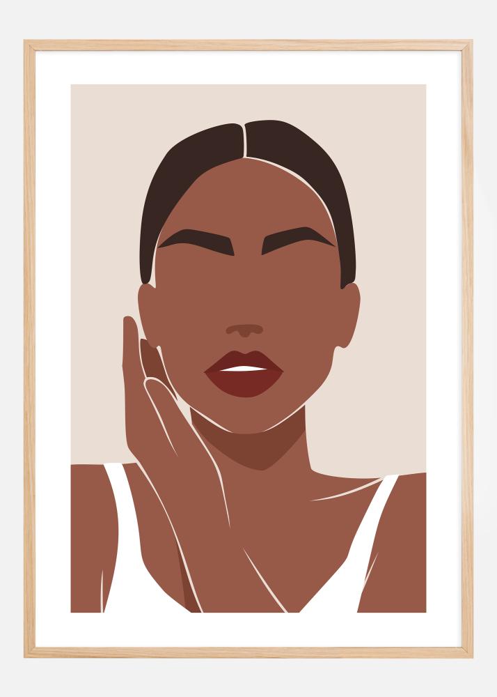 Tento esteticky přitažlivý plakát zobrazuje ženskou siluetu ve stylizované a zjednodušené formě. Obrázek je sestaven s omezeným barevným spektrem složeným z přírodních tónů, od světlé béžové po tmavší hnědou, což dodává pocit tepla a přívětivosti. Postoj ženy je uvolněný a zamyšlený, což přináší do portrétu pocit klidu a sebevědomí.