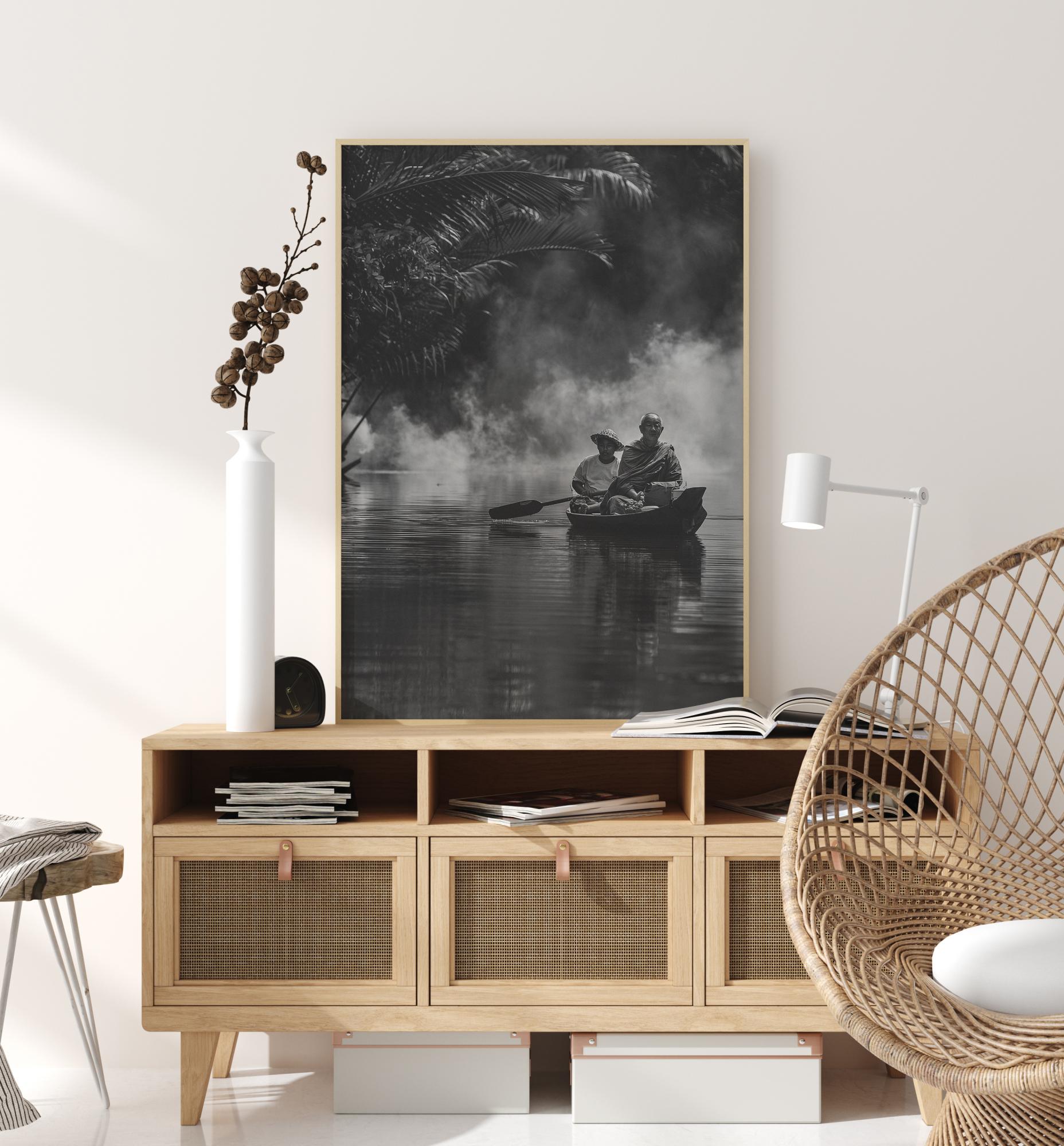 Poklidná černobílá detailní fotografie dvou mužů, kteří plují po řece. Dva muži sedí poklidně na své thajské gondolové rybářské lodi a zdá se, že pozorují své okolí. Přirozené sluneční světlo, které prosvítá skrze mraky, se odráží na vodě před lodí. Na tomto plakátu lze téměř slyšet ticho. Perfektní pro klidné prostředí.