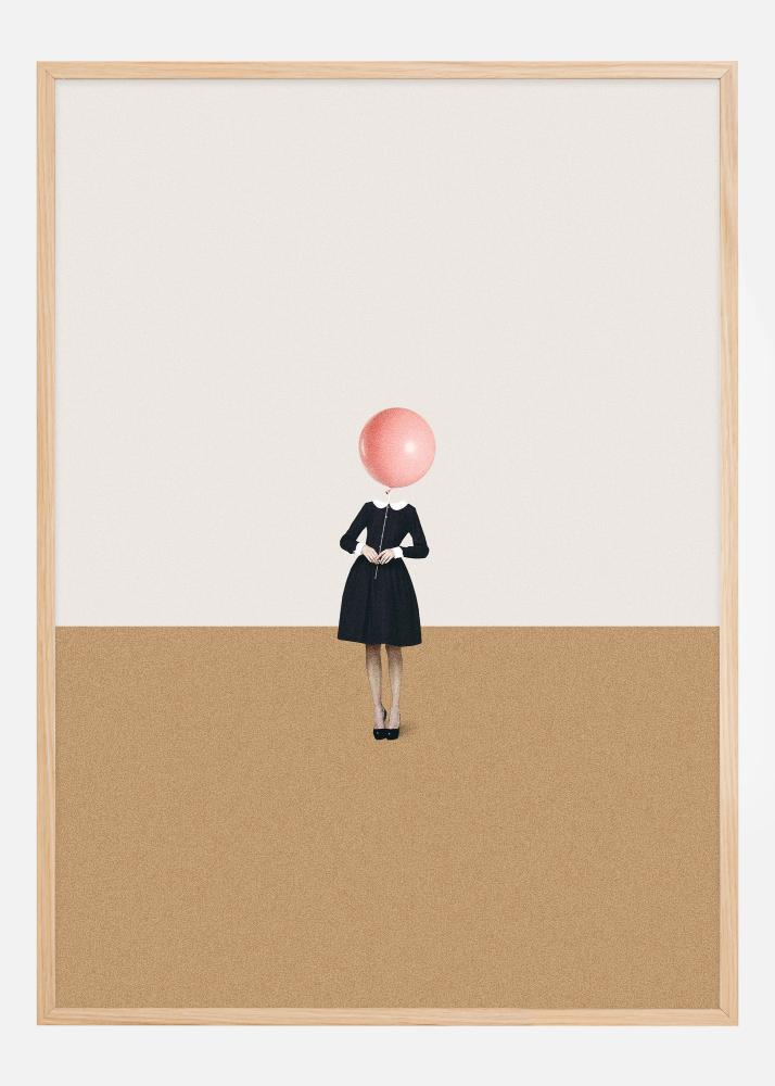 Tento umělecký plakát upoutá pozornost svým jednoduchým, ale silným obrazem ženy oblečené v černých šatech, stojící o samotě na pozadí teplých pískových tónů. Drží to, co se zdá být dokonale sférická, růžová bublina nad její hlavou, což vytváří vizuální a myšlenkově provokativní kontrast mezi osobou a okolní plochou.
