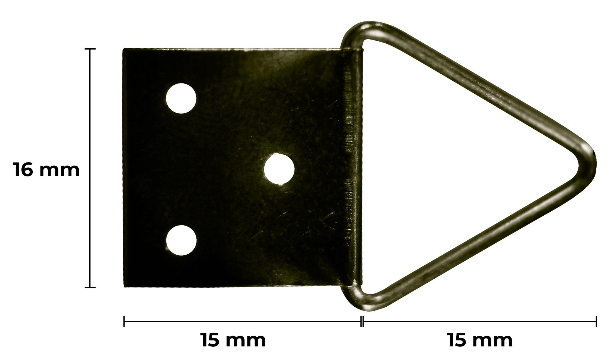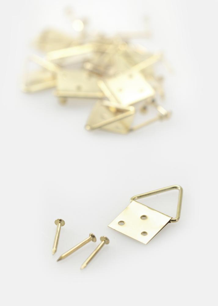 Trojúhelníkový věšák z mosazi. Připevní se na zadní stranu rámu. Lze použít jako jeden věšák nebo dva věšáky, pokud chcete použít obrázkový drát. Tento věšák se skvěle hodí pro trochu větší obrazy (maximální rozměr: 60x90 cm)