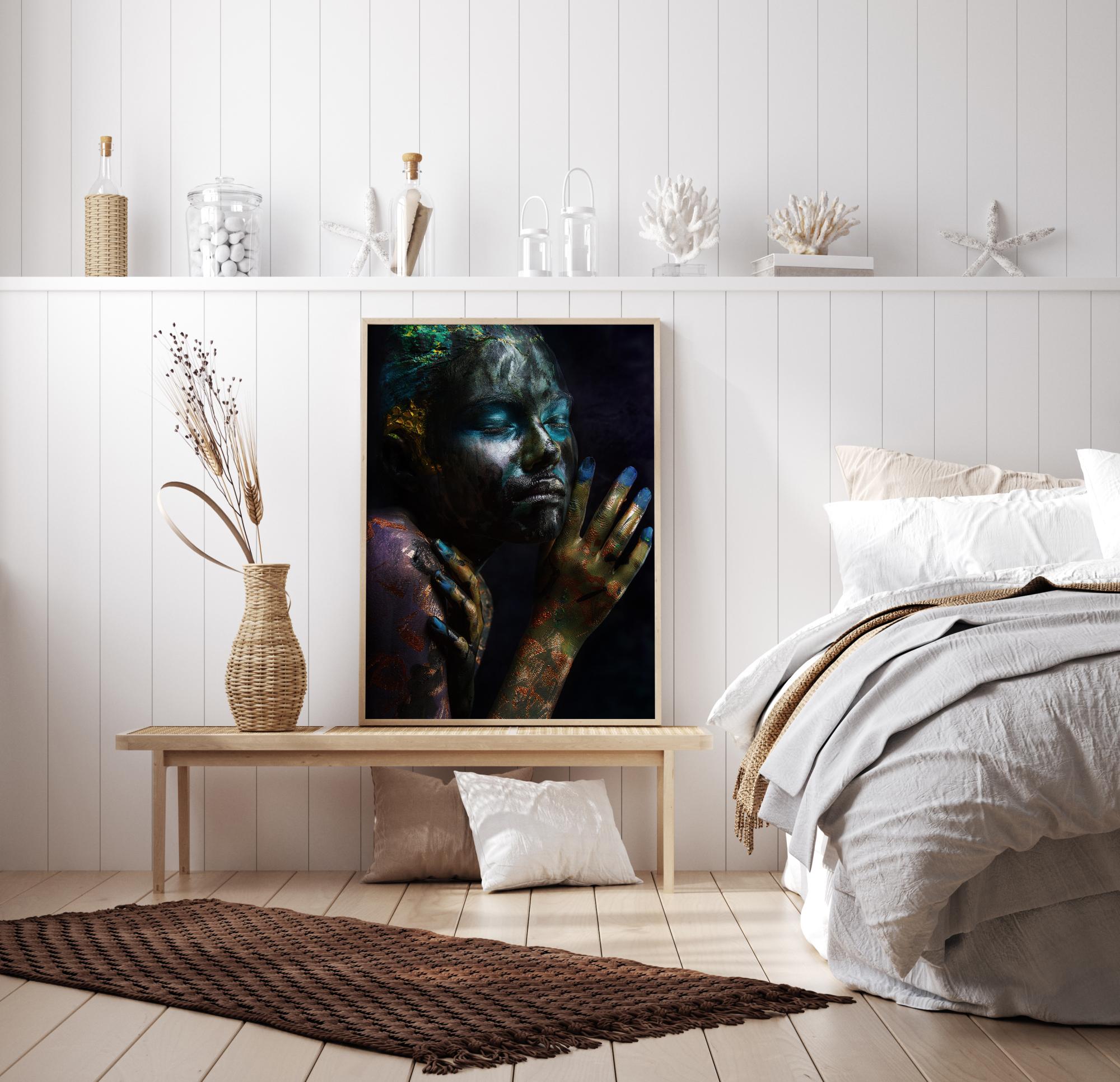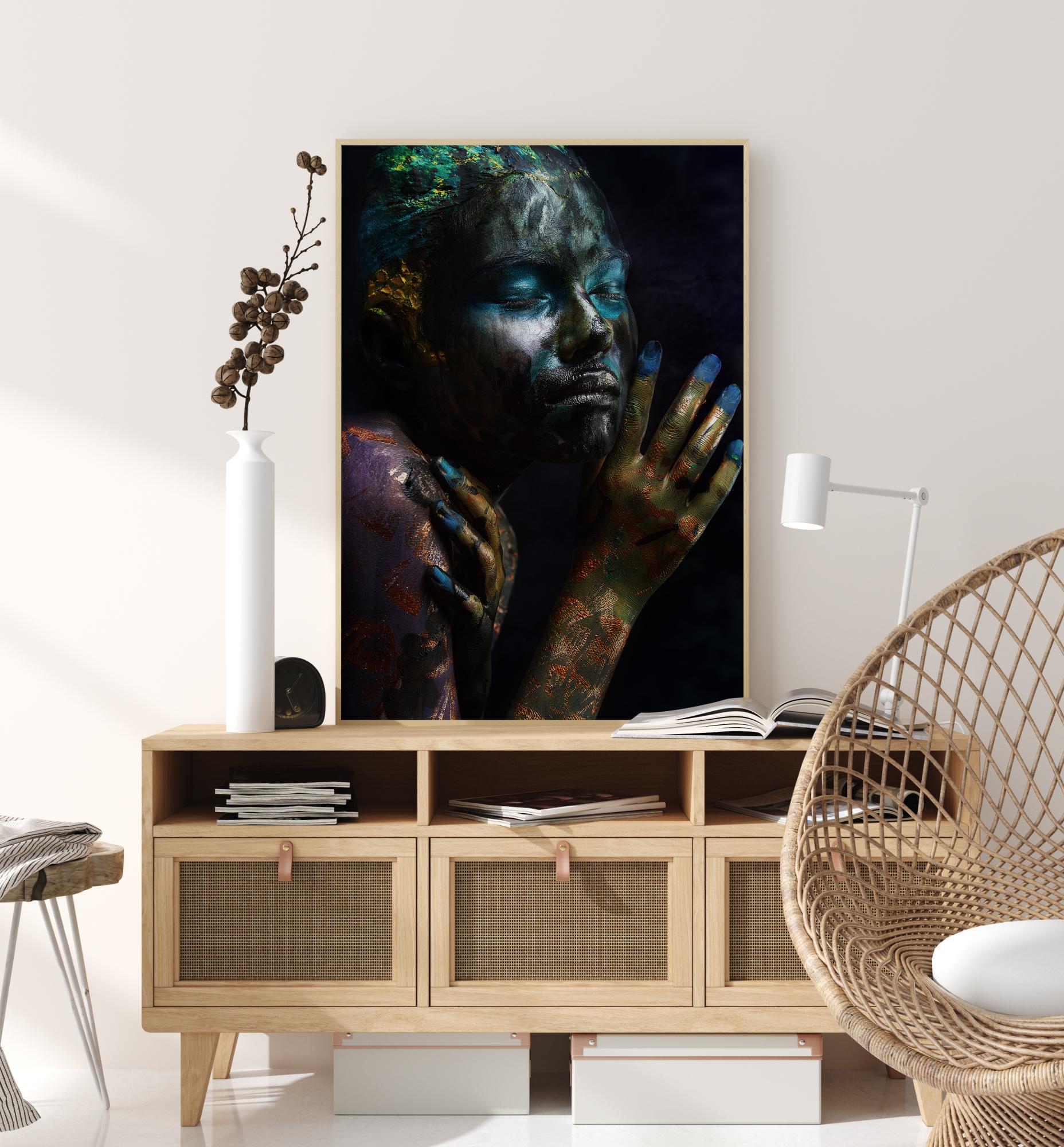 Ohromující tisk ženy pokryté barvou. Na černém pozadí je žena pokryta pestrobarevnými barvami. Díky přirozenému světlu, které osvětluje tvář a ramena ženy, je zvýrazněna intenzita barev. Krásný plakát, který může dodat barvu bílé stěně.