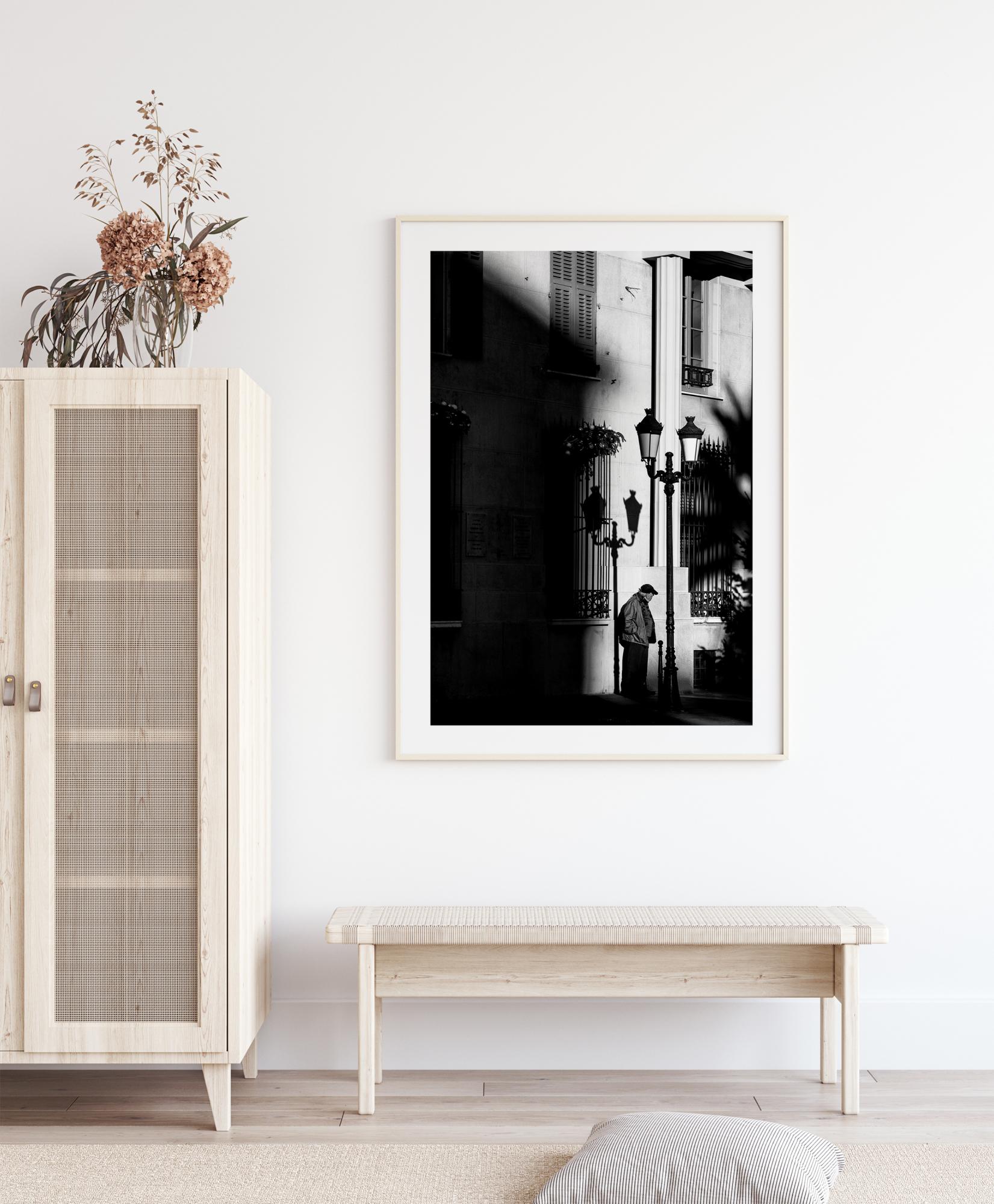 Fotografie v černobílém provedení starého muže, který se zkoumavým pohledem dívá na něco obklopeného živou městskou stínohrou. Klidný a krásný plakát, který vypadá stejně dobře sám o sobě jako s dalšími oblíbenými kousky na větší nástěnce obrazů.