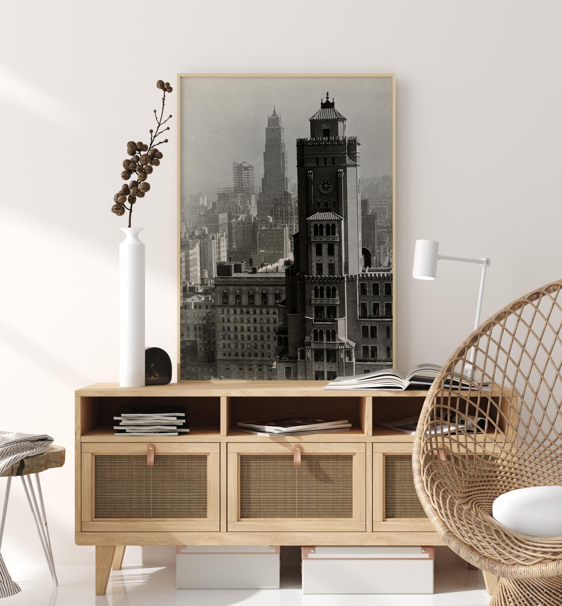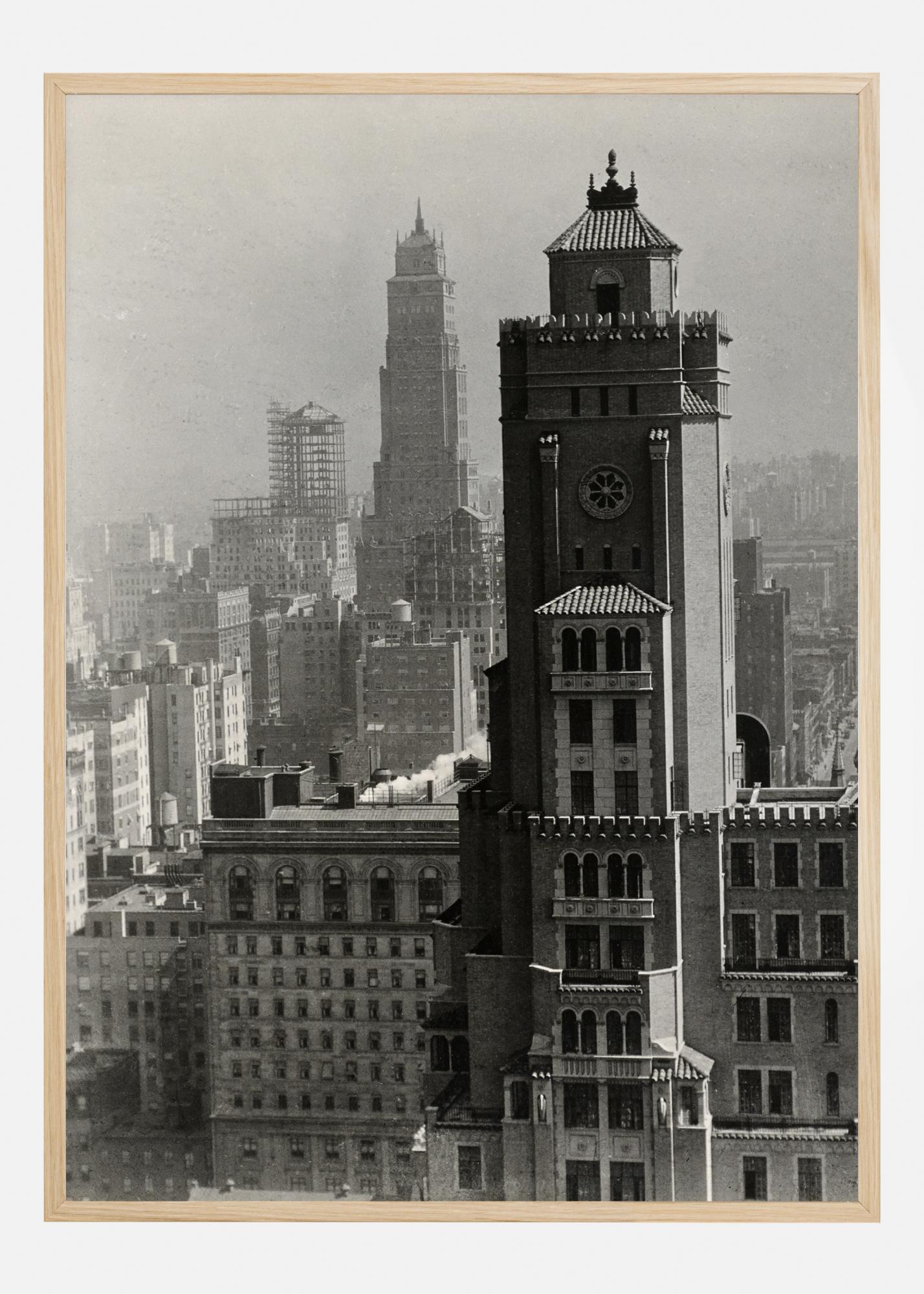 Černobílý tisk s starým městem. Šedá linie města dokonale splývá se stejně šedými budovami. Město se skládá z budov různé výšky. V popředí dopadá přirozené světlo přímo na východní stranu hlavní budovy. Pověste tento plakát do své pracovny a pozorujte staré město.
