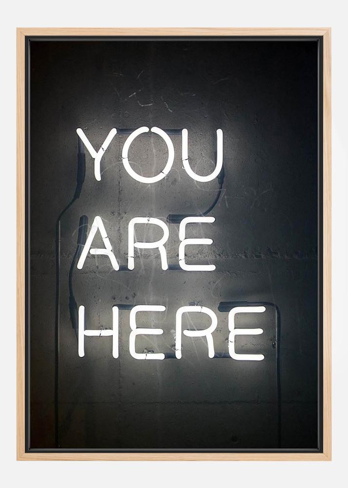 Černobílý textový plakát s neonovým nápisem a informativním textem "Jste zde". Jednoduchý a stylový obraz s příjemným humorným prvkem, ideální pro kombinaci s ostatními z našich úžasných motivů na větší zeď obrazů.