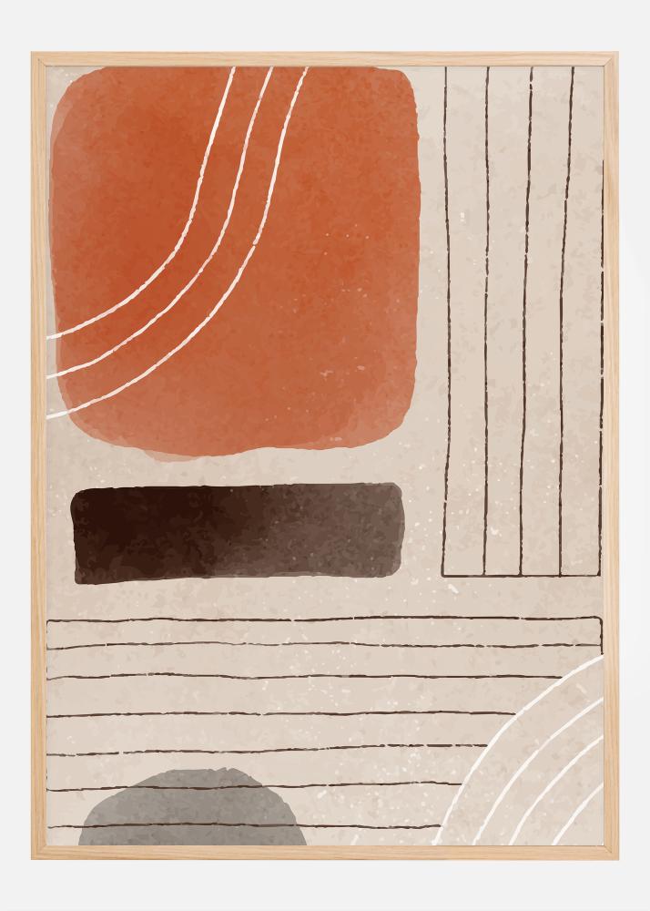 Tento umělecký plakát hraje na abstrakci a geometrii a evokuje hlubší pocit reflexe. V motivu se nachází velký plný terakotový čtverec, který ukotvuje design, lemovaný bílými křivými liniemi, jež dávají dojem pohybu a měkkosti. Tato teplá, zemní barva vytváří okamžitý pocit tepla a přívětivosti.