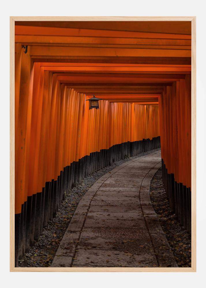 Plakát s kamennou cestou lemovanou oranžovými a černými dřevěnými podpěrami. Uprostřed cesty visí železná lucerna. Přirozené světlo osvětluje cestu, na kterou spadlo několik malých podzimních listů. Krásný tisk, který může oživit jakoukoli zeď.