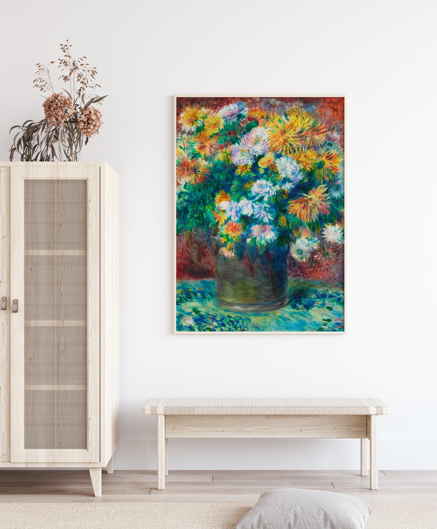 Pestrý malovaný plakát s kyticí květin. Na vícebarevném pozadí vytváří tato krásná škála barev veselou atmosféru. Květiny jsou umístěny na tyrkysovém plátně, které zdůrazňuje všechny světlé barvy v tomto obraze. Perfektní tisk pro všechny, kteří milují květiny.
