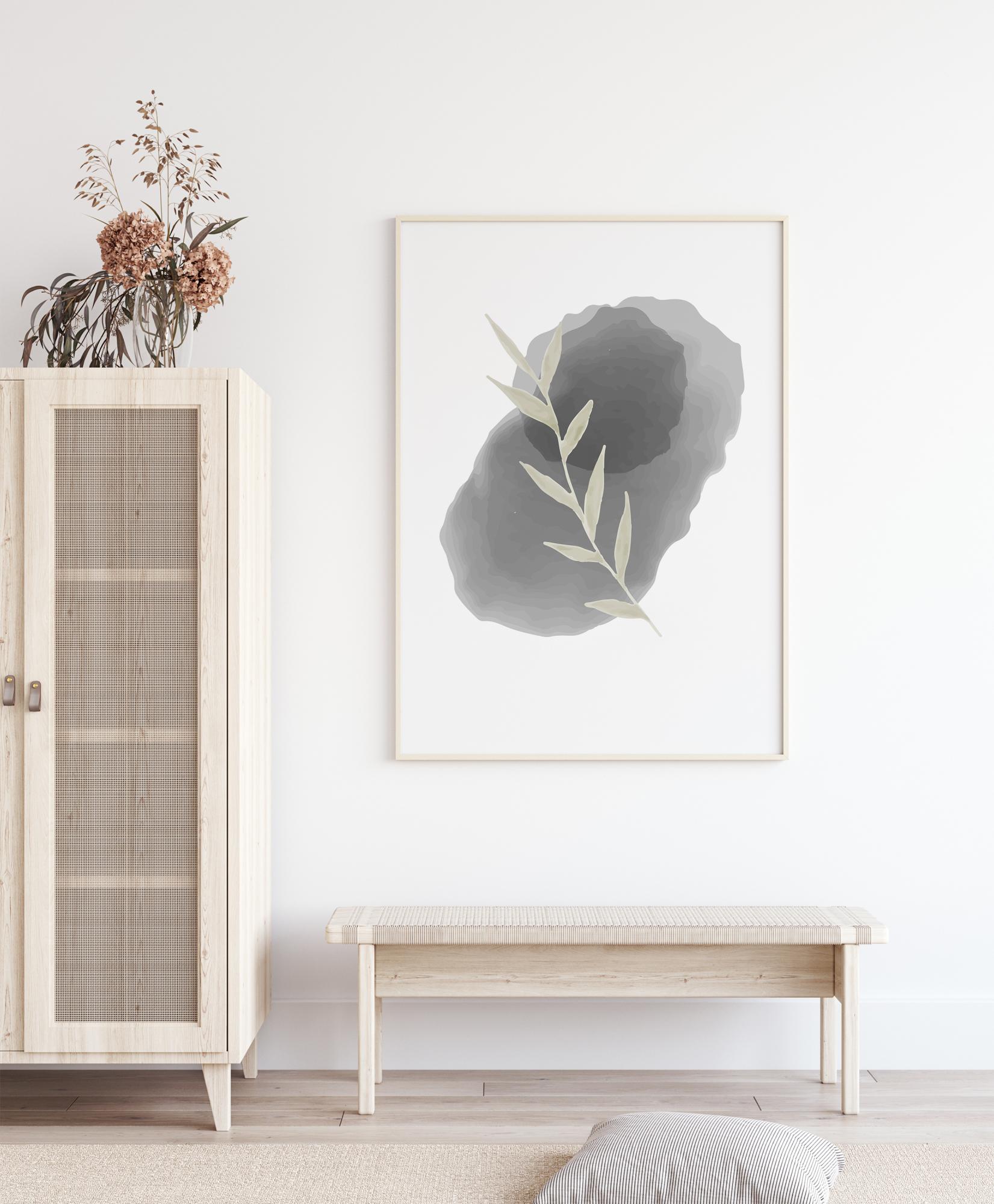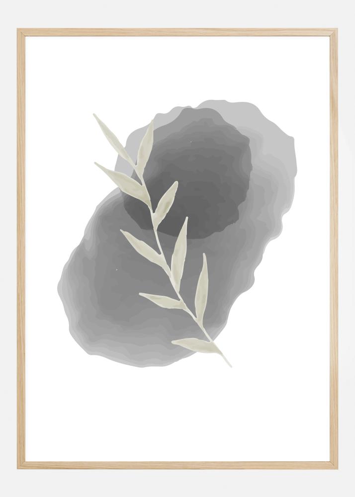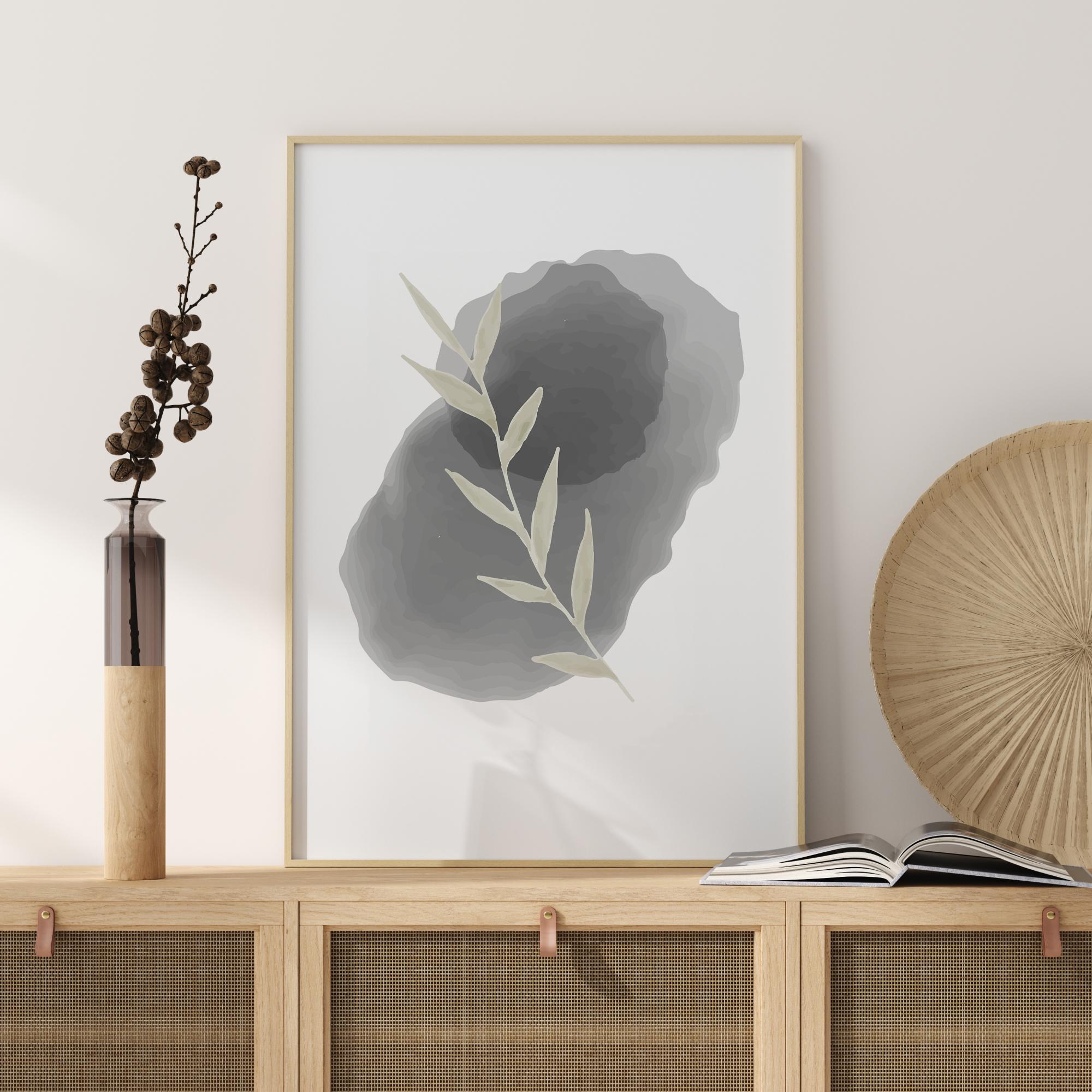 Jednoduchý otisk béžově zbarveného listu umístěného na oválném kameni. Na bílém pozadí sedí list na dvou různých kamenech: malý černý kámen položený na větším béžově zbarveném kameni. Dopřejte svému domovu dotek jemnosti s tímto plakátem.