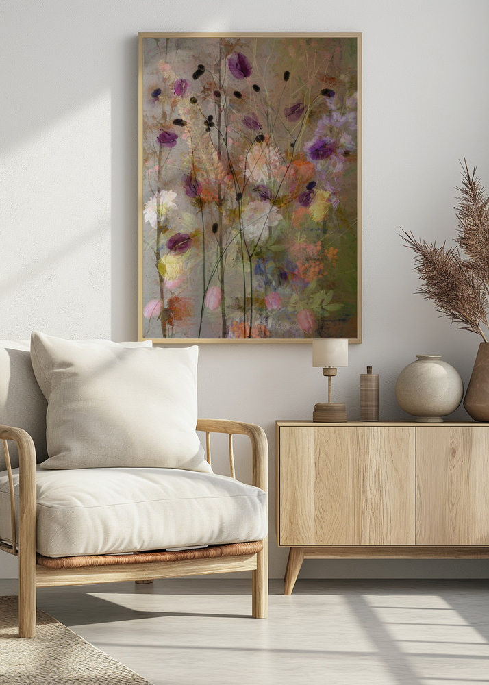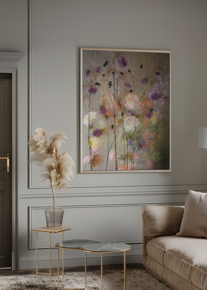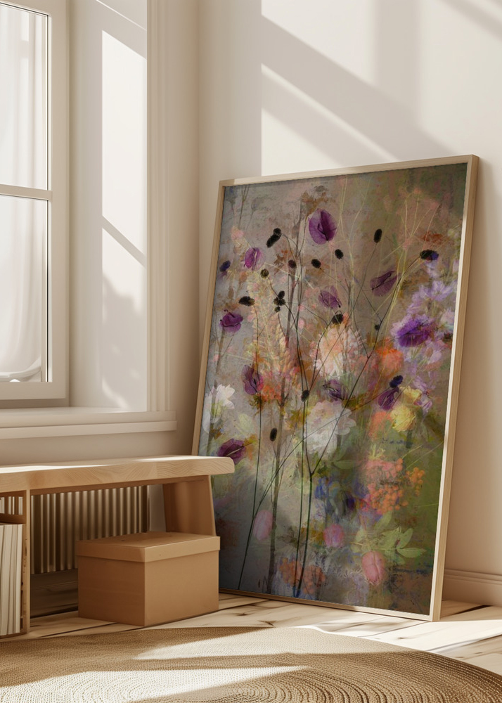 Nádherný ručně malovaný tisk fialových a bílých sušených květin. Na béžovém pozadí vytvářejí přirozené barvy květin uvolňující atmosféru. Měkké zelené, fialové a oranžové tóny jsou velmi jemné pro oko. Krásný plakát, který se hodí vedle vašeho toaletního stolku.