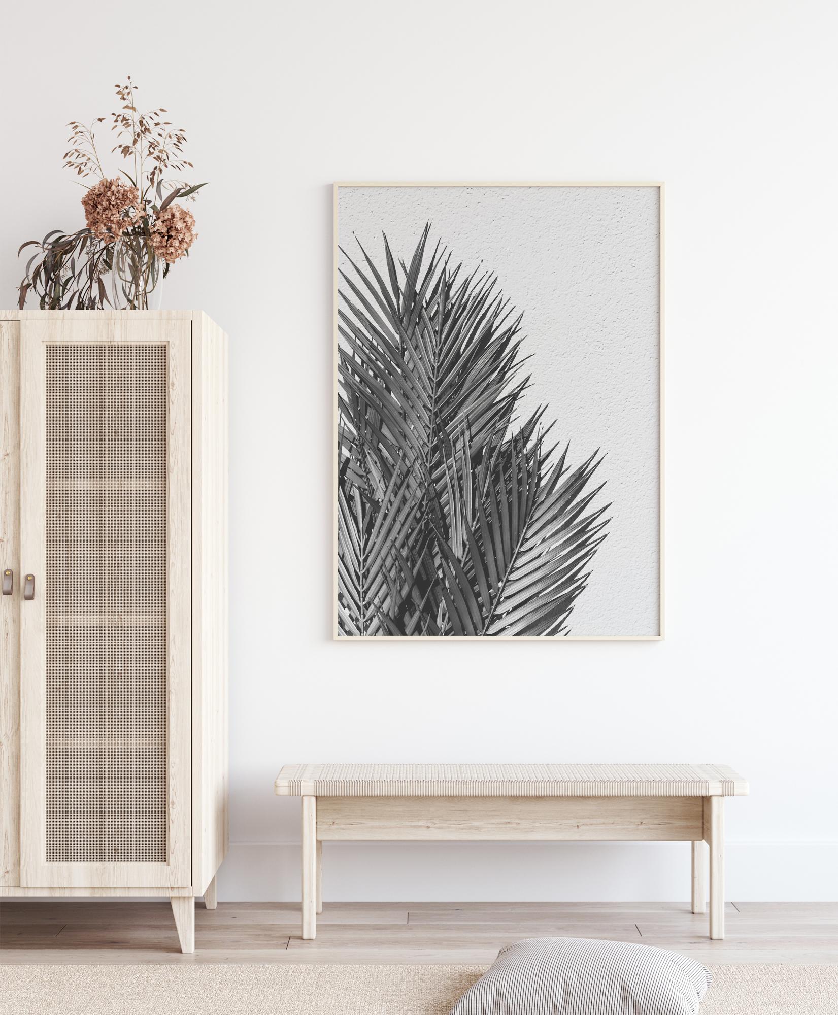 Černobílý plakát s palmovými listy, které se opírají o drsnou bílou stěnu. Drsná stěna zvýrazňuje palmové listy ležící na sobě. Když stojíte vlevo od obrazu, téměř cítíte, jak teplo dosahuje na listy. Pověste tento tisk ve svém letním domě pro tropickou atmosféru.