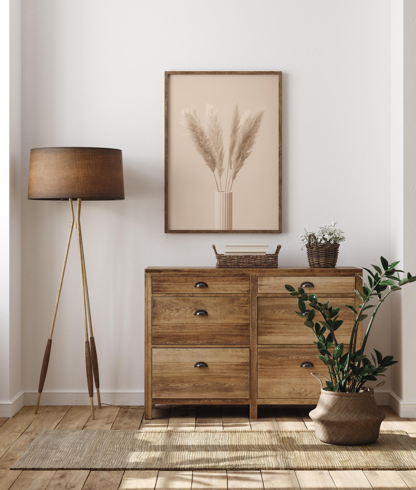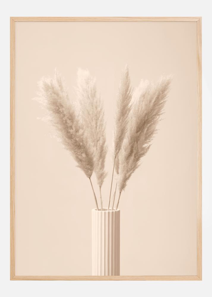 Květinový plakát s pampovou trávou ve váze. Hlavice trávy vynikají na růžovém sepiovém pozadí, což vytváří pocit měkkosti, kde váza představuje tvrdost. Tento obrázek dodává domovu nádech elegance.
