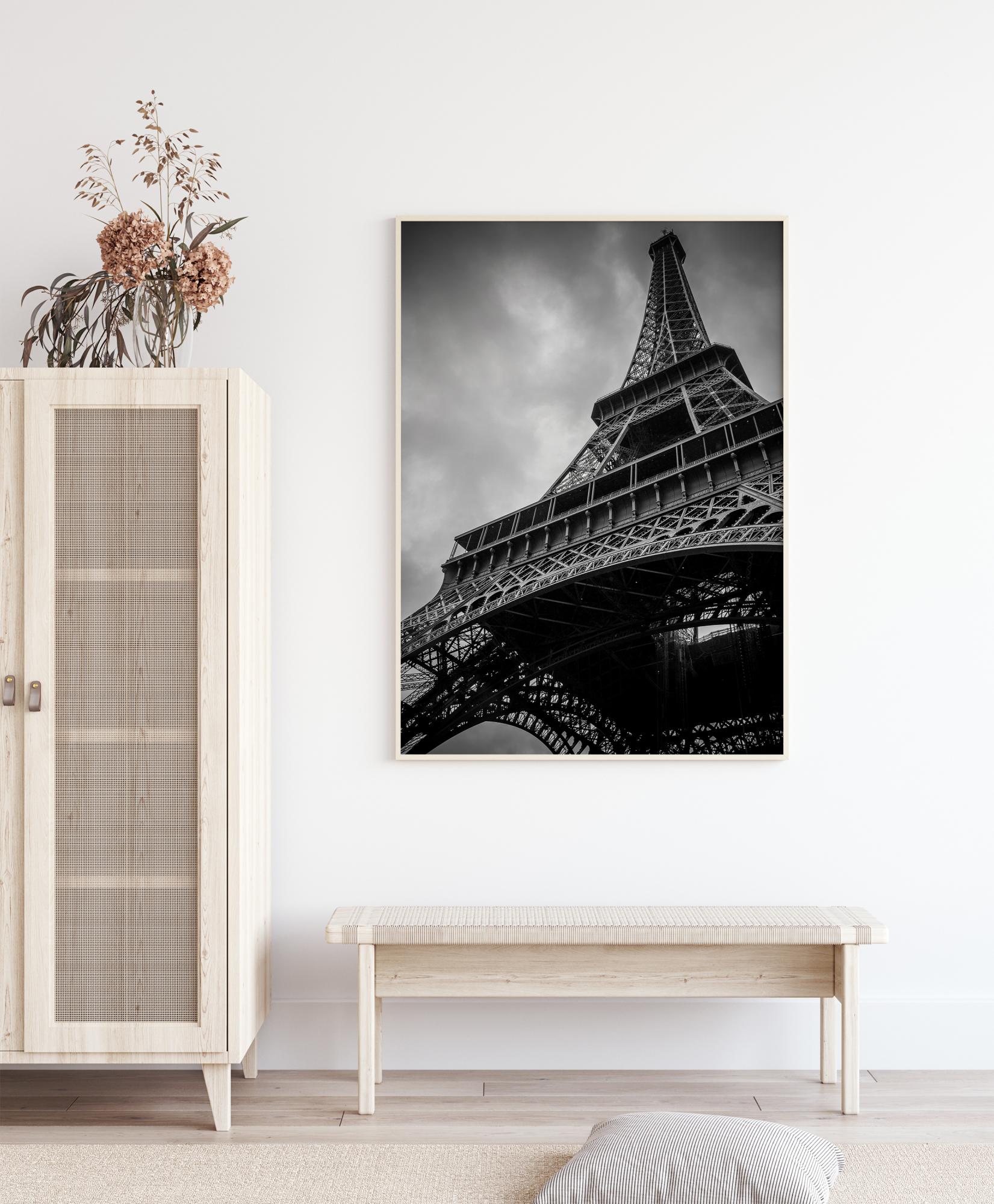 Perspektivní plakát zespodu ohromující Eiffelovy věže. S oblačnou šedou oblohou ukazuje tato krásná železná struktura svou pyramidovou formu, když se tyčí vysoko. Pro všechny, kdo milují Paříž, je to perfektní dárek k darování.