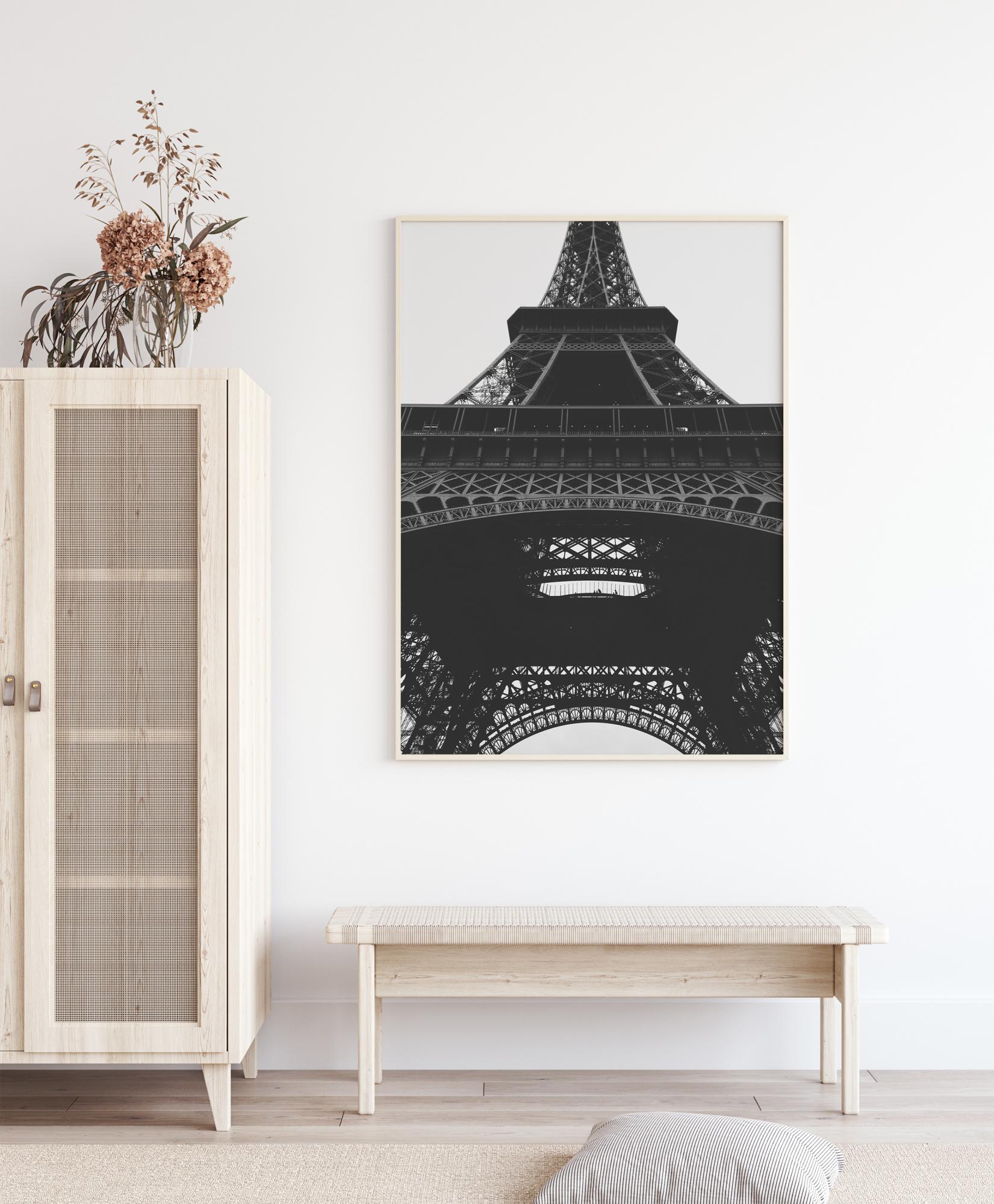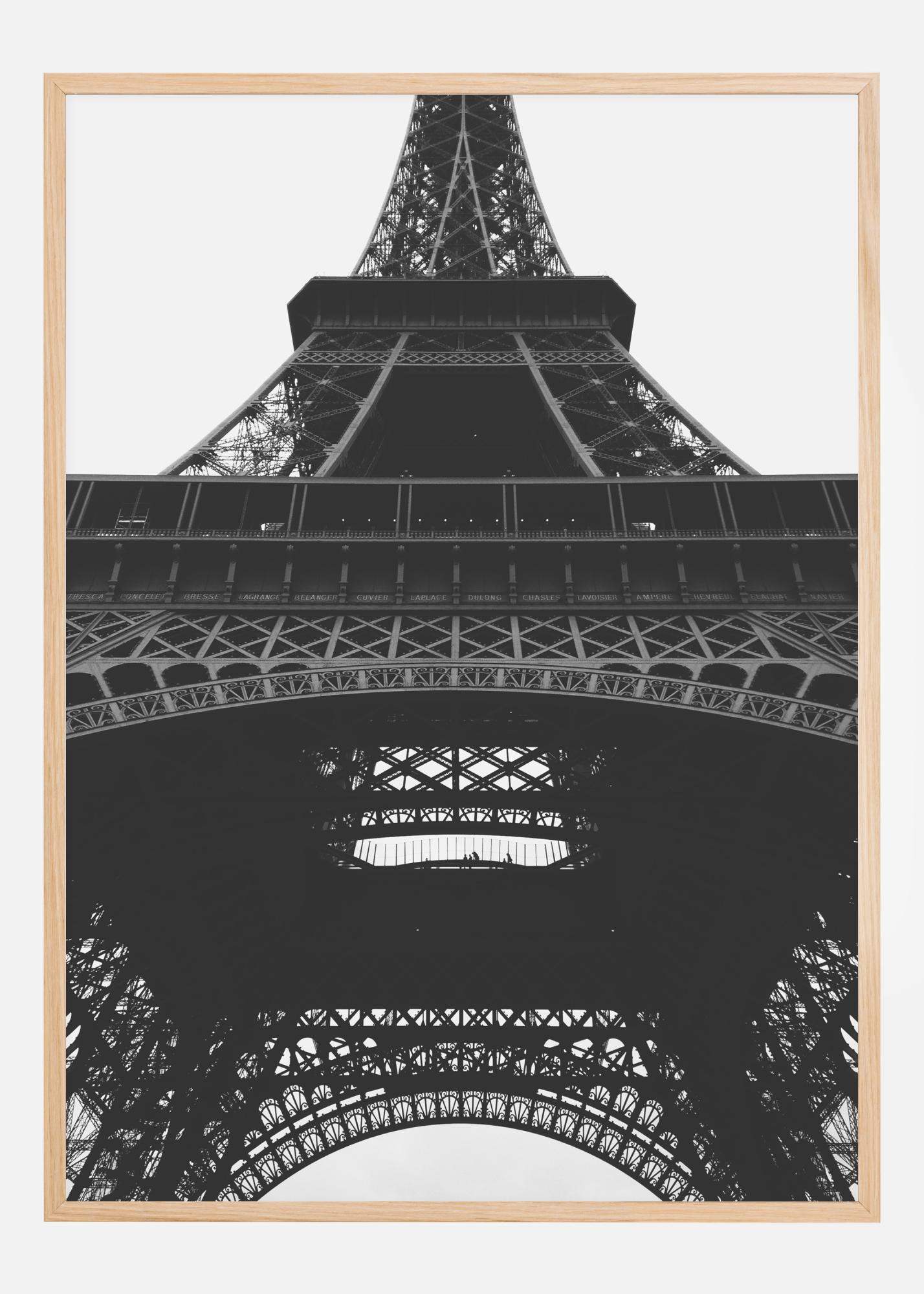 Úžasný černobílý plakát s Eiffelovou věží. Fotografie masivní železné konstrukce je pořízena z žabí perspektivy a umožňuje věži dokonale splynout se šedou oblohou. Toto technické mistrovské dílo vytváří lehkou, vzdušnou a silnou strukturu. Perfektní tisk, který se hodí k zavěšení v moderním prostředí.