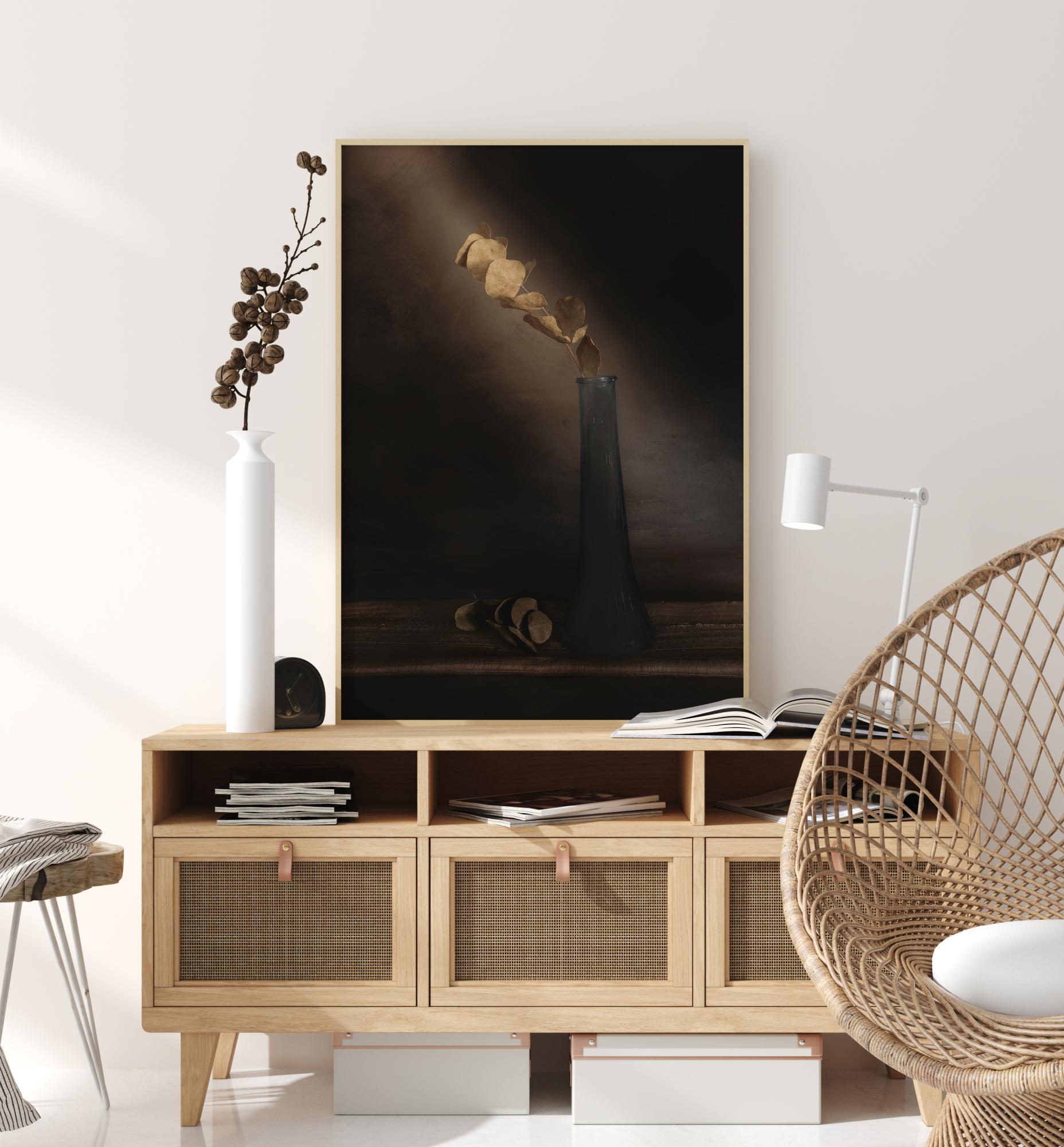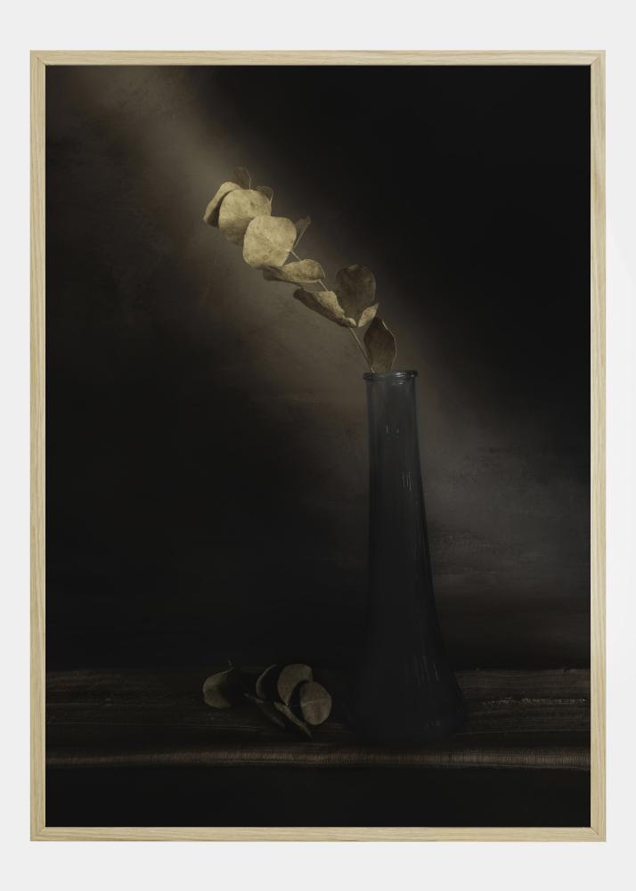 Jednoduchý, ale krásný tisk jednoduchého stonku se sušenými listy ve skleněné váze. Proti světle hnědému pozadí dopadá přirozené světlo přímo na sušenou trávu. Na dně obrázku leží sbírka listů, které spadly z kmene. Krásný plakát, který se hodí zavěsit v klidném prostředí.