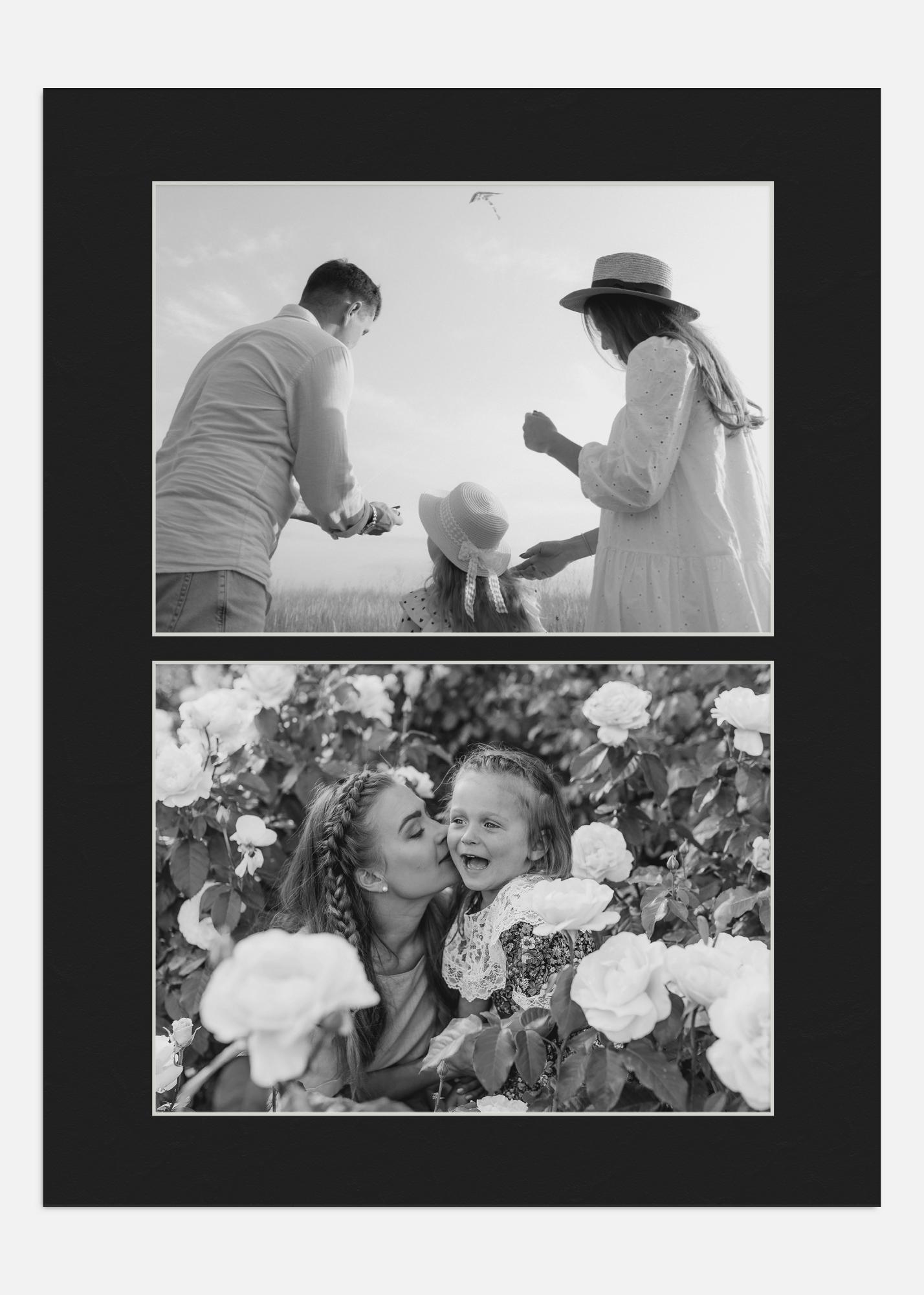 Bez kyselin černá collage pasparta se šikmými bílými okraji nejvyšší kvality. V paspartě je místo pro 2 obrázky. Perfektní, když si chcete vytvořit vlastní fotokoláž.