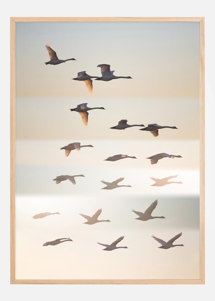 Plakát divočiny s hejnem hus letících vysoko při západu slunce. Tento malebný obraz vypráví příběh o migraci, vše na pozadí krásných modrých a oranžových barev. Připojte se k této cestě, když jej pověsíte doma.