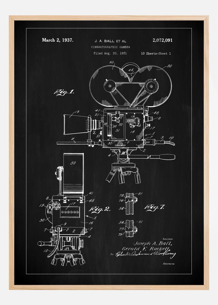 Tento elegantní patentovaný plakát je součástí naší sbírky a představuje inovativní kinematografickou kameru navrženou Josephem A. Ballem a Geraldem F. Rackett. Patentována byla 2. března 1937 s patentovým číslem 2,072,091, nejde jen o plakát, ale o historický dokument, který zobrazuje vývoj filmové technologie. Perfektní pro ty, kteří si cení filmové historie a jejích raných technologických pokroků, tento patentovaný plakát vnáší současný nádech do klasického designu.